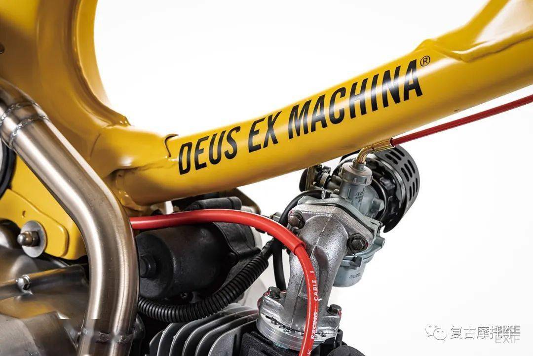 發(fā)動機(jī)部分沒有做太大的改裝,他們把化油器的進(jìn)氣管調(diào)轉(zhuǎn)了180度,安裝了一個高流量空濾,一條紅色的NGK高壓線起到了很好地點綴作用,原來固定在主梁上的高壓包也被藏了起來,原車的電瓶也被去掉了。