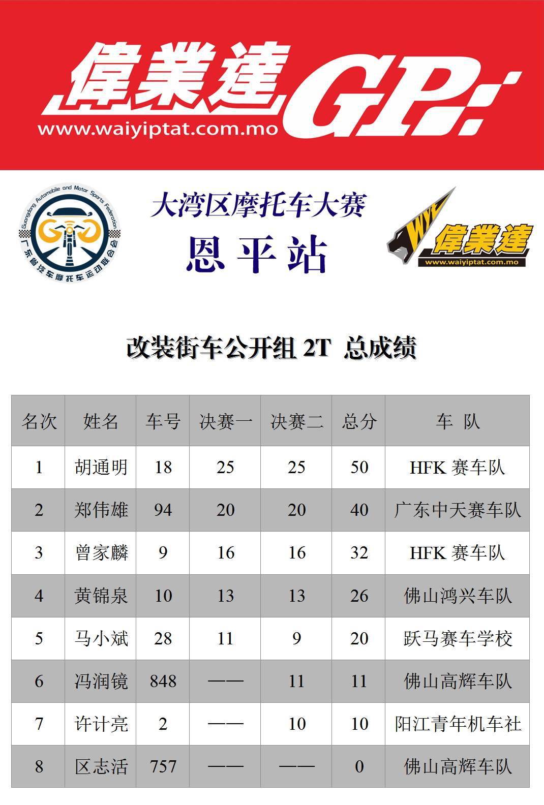 每個(gè)組別經(jīng)過兩節(jié)賽事(決賽一、決賽二)的激烈競(jìng)爭(zhēng),最終賽出了各自的成績(jī)。這次恩平站的比賽,最后名次以兩節(jié)比賽的積分相加作為依據(jù):每一節(jié)的比賽,名次與對(duì)應(yīng)獲得的積分、其計(jì)算方式與 FIM 所通行的規(guī)則相同(也就是跟 MotoGP、WSBK 等相同),第一名有 25 分、第二名有 20 分、第三名有 16 分,直至第十五名的、有 1 分。在沒有超過十五名參賽者的情況下,如果沒有完成比賽的三分之二賽程以上,無論任何名次、都沒有積分。