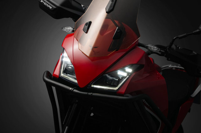 全車均采用LED燈源,鷹眼雙透鏡前大燈,X-CAPE 650并沒有采用ADV車型常見的鳥嘴設(shè)計(jì),因此辨識(shí)度非常高。