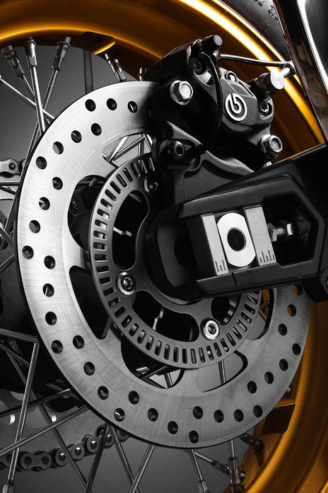 MARZOCCHI前減震,具備預(yù)載多段、雙向阻尼可調(diào)前減震,行程160mm;KYB可調(diào)后減震,具備預(yù)載多段、雙向阻尼可調(diào)減震,行程150mm。值得一提的是,這根MARZOCCHI的前減震,是和摩托莫里尼聯(lián)合開發(fā),耗時(shí)一年多專為該車量身打造。