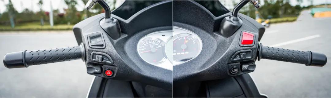 X7的手把按鍵也是平平無(wú)奇,不帶按鍵背光,不過(guò)該有的功能也都配齊了,在打火鍵內(nèi)測(cè)是ASR牽引力控制的關(guān)閉開(kāi)關(guān),還配備有雙閃和熄火開(kāi)關(guān),現(xiàn)在的一些大踏板甚至將熄火開(kāi)關(guān)都省去了,當(dāng)然都有邊撐熄火,對(duì)于踏板車(chē)來(lái)說(shuō)影響不大。