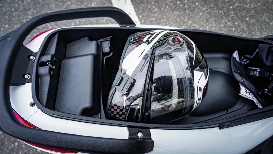 能夠看到X7的座桶空間還算比較可觀,在250這個(gè)級(jí)別里能夠放下一頂全盔,并且還能夠合上是真的不太多見(jiàn),并且前半部分還有空余可以儲(chǔ)物,或是再放一頂瓢盔。而且它的坐墊打開(kāi)方式比較特別,是按壓鑰匙孔由此我就發(fā)現(xiàn)一個(gè)BUG,那就是拔掉鑰匙直接徒手推鑰匙孔,它也能打開(kāi)坐墊,只有鎖了龍頭鎖才無(wú)法打開(kāi)坐墊,所以盡量不要放一些貴重物品在座桶內(nèi)。
