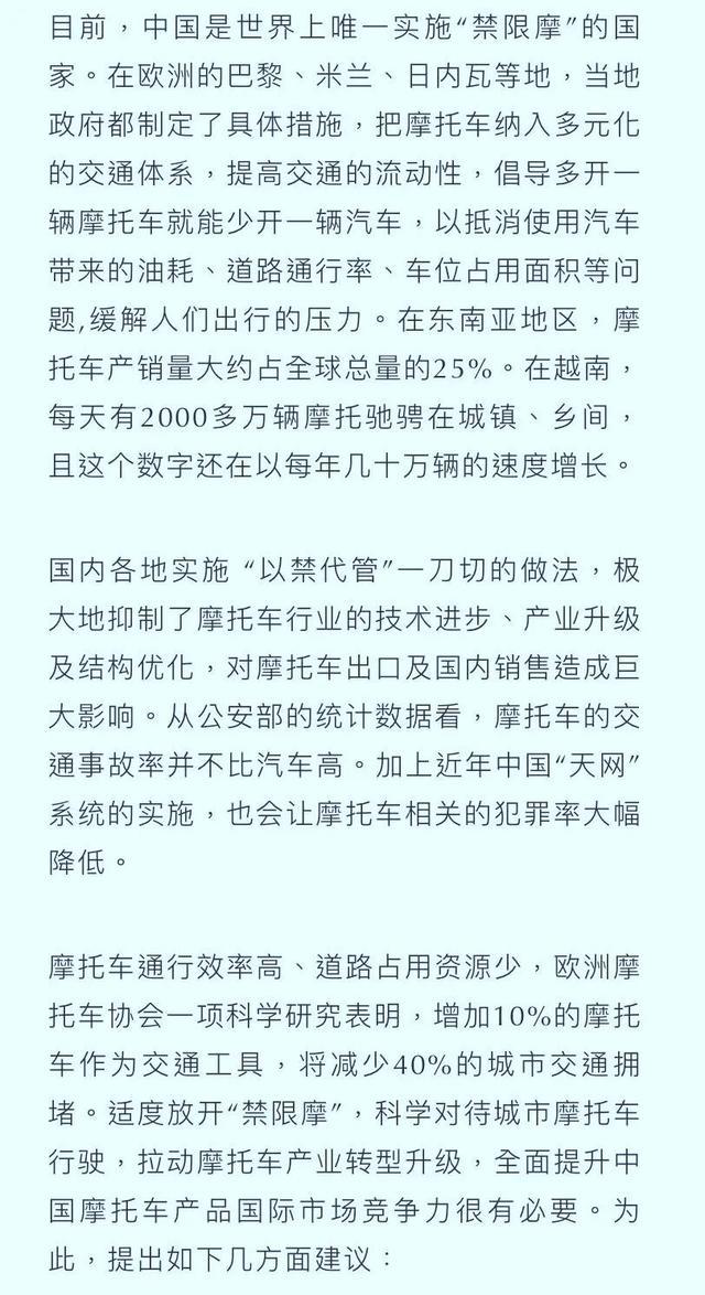 說實話,這是我第一次有耐心和興趣去讀完一篇完整的兩會提案,這也足以使我改變對李書福這位印象中只會埋頭造車的木訥理工男的刻板成見,雖然稱不上文采斐然,但卻勝在言簡意賅、細致周全,有理有據(jù);雖然不能確定是否經(jīng)過深入廣泛的社會調研,但至少在說理上進行了充分的科學論證和數(shù)據(jù)支持而非僅憑個人喜好。短短千余字,就將呼吁放開禁限摩的理由剖析的言之鑿鑿,頭頭是道。這篇議案首先將人們對摩托車心懷偏見的所有理由納入考量并針對性地一一反擊,文章落筆之時,也封死了反對者們回懟他的大門。李書福并不是盲目主張全面放開對摩托車的管制,但我們恰恰能從文中“科學規(guī)劃”與“適度放開”的用詞用語和目前”以禁代管”一刀切的做法的鮮明對比中,體會到這篇議案的強大說服力與道義合理性。