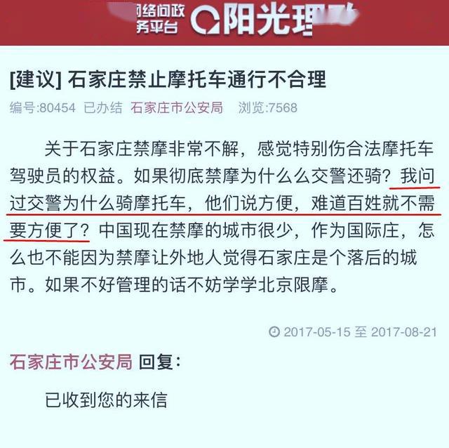 最后,想到了石家莊禁摩后某個市民在政府網(wǎng)站的留言,幽默又辛酸:“我問交警為什么騎摩托車,交警說方便,難道百姓就不需要方便了?”