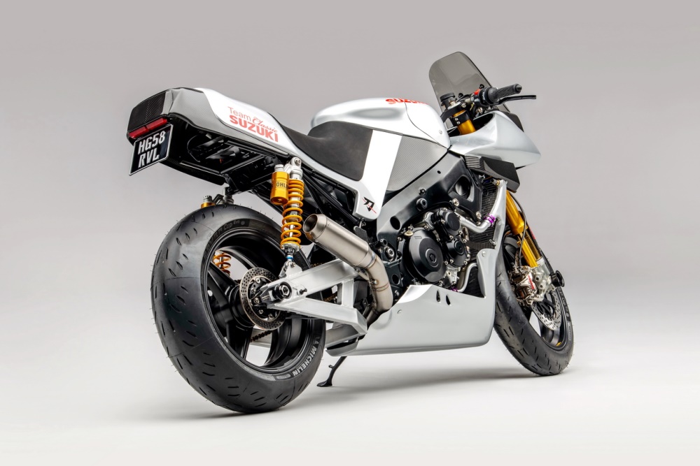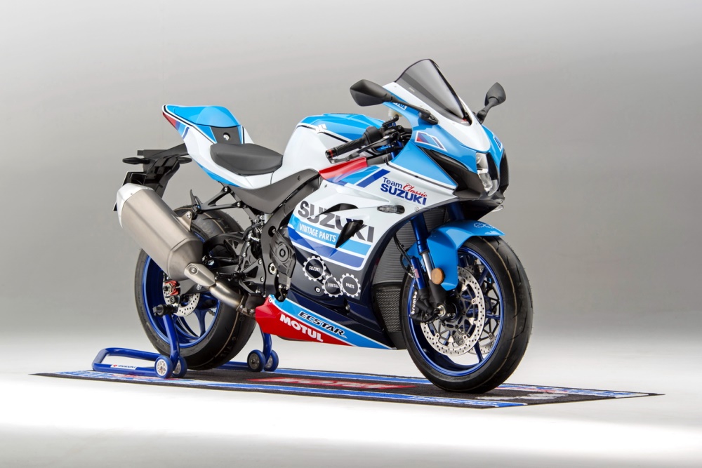 下面的圖片,“ Suzuki 經(jīng)典車隊 ” 在 2018 年推出的,采用了老款 GSX-R750 外觀圖案/貼花風(fēng)格,并標(biāo)配了兩端牛角護(hù)桿、后座外蓋、發(fā)動機兩側(cè)護(hù)蓋等組件的 GSX-R1000R “ Suzuki 經(jīng)典車隊 ” 復(fù)制版。