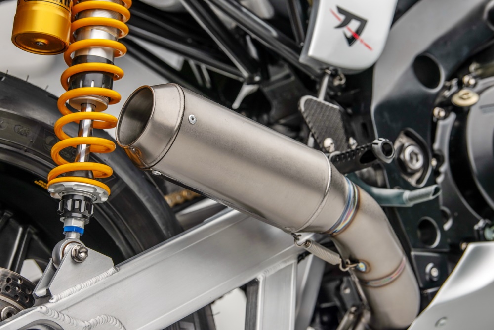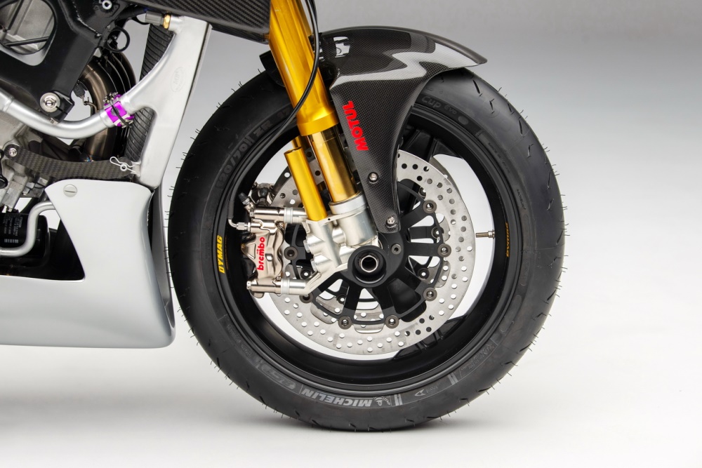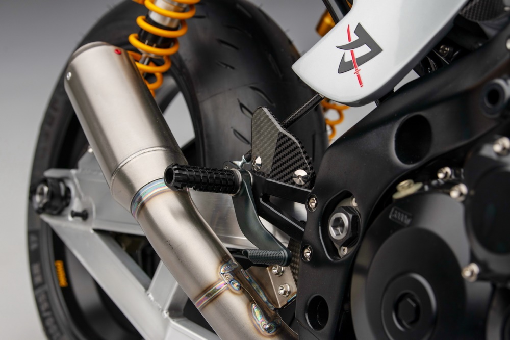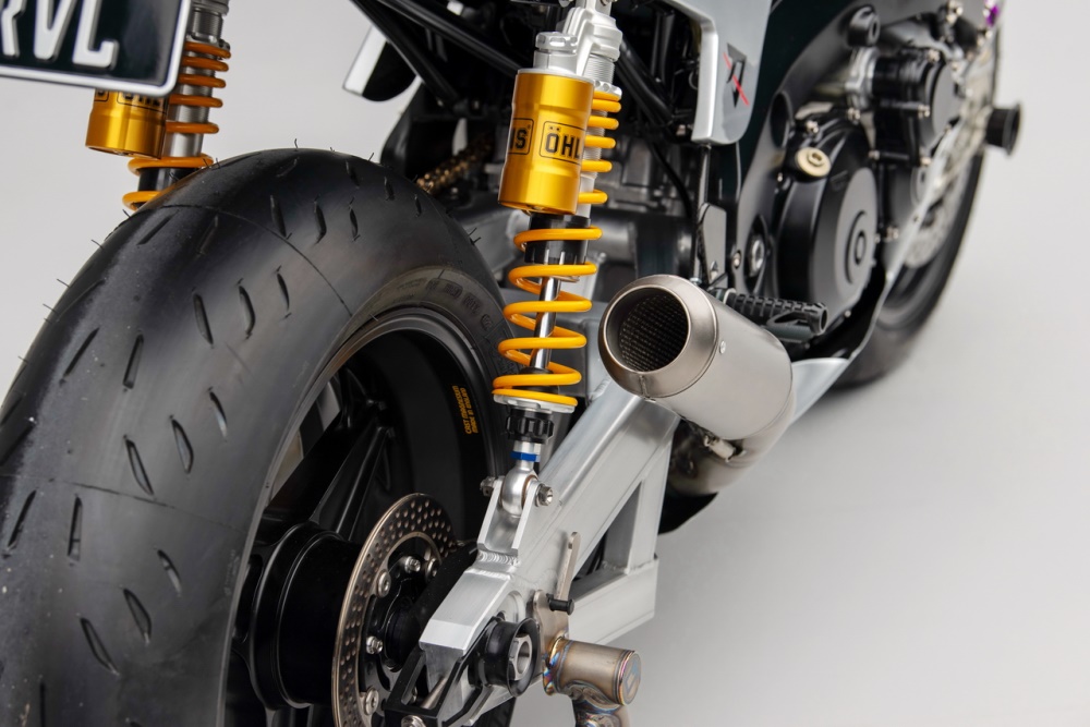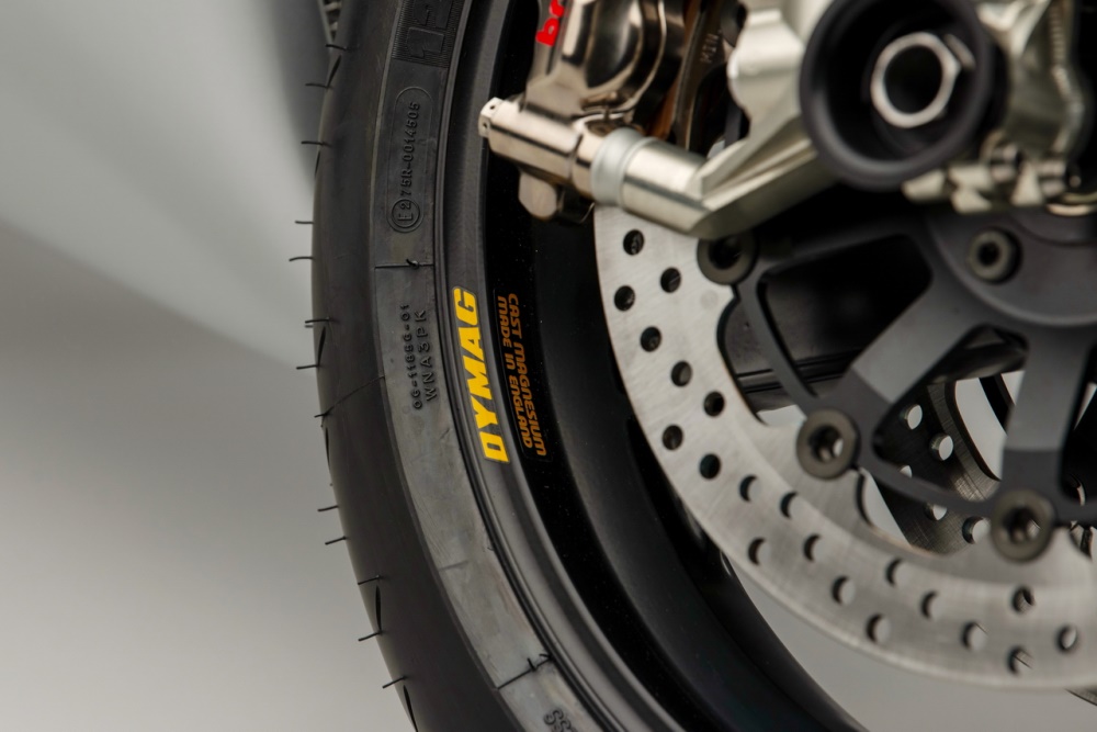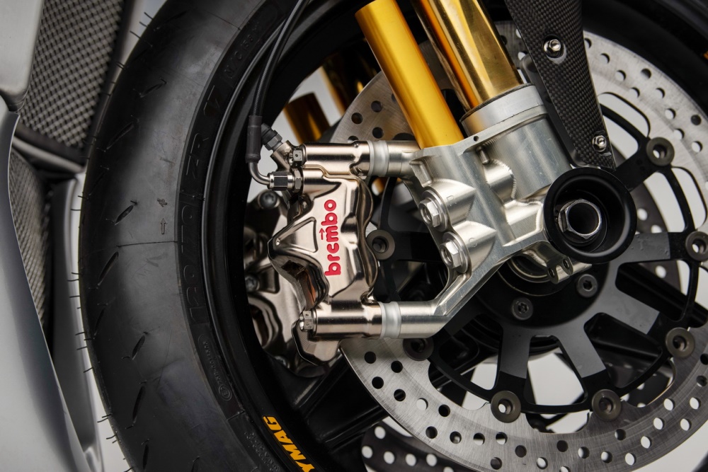 車架的主樑同樣是來自 GSX-R1000R K8 工廠賽車,鋁合金的后搖臂來自改裝品牌 Alpha Performance Fabrications,懸掛系統(tǒng)來自 Ohlins 奧林斯、制動系統(tǒng)則是采用了 Brembo 布博,Dymag 的 CH3 前后輪框。