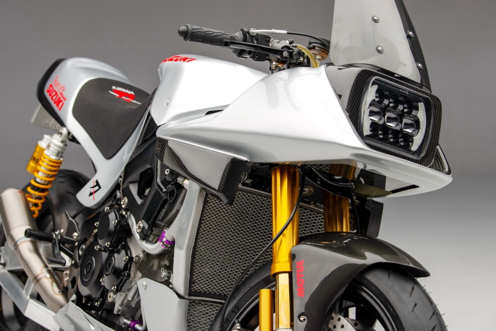 這臺 Katana “ 刀 ” 定制車,有著一個重要的特點:采用了 Suzuki 在 2008 年 WSBK 時的工廠車隊 Team Suzuki Alstare,所使用的工廠賽車 GSX-R1000R K8 之動力單元和車架主樑。