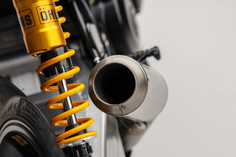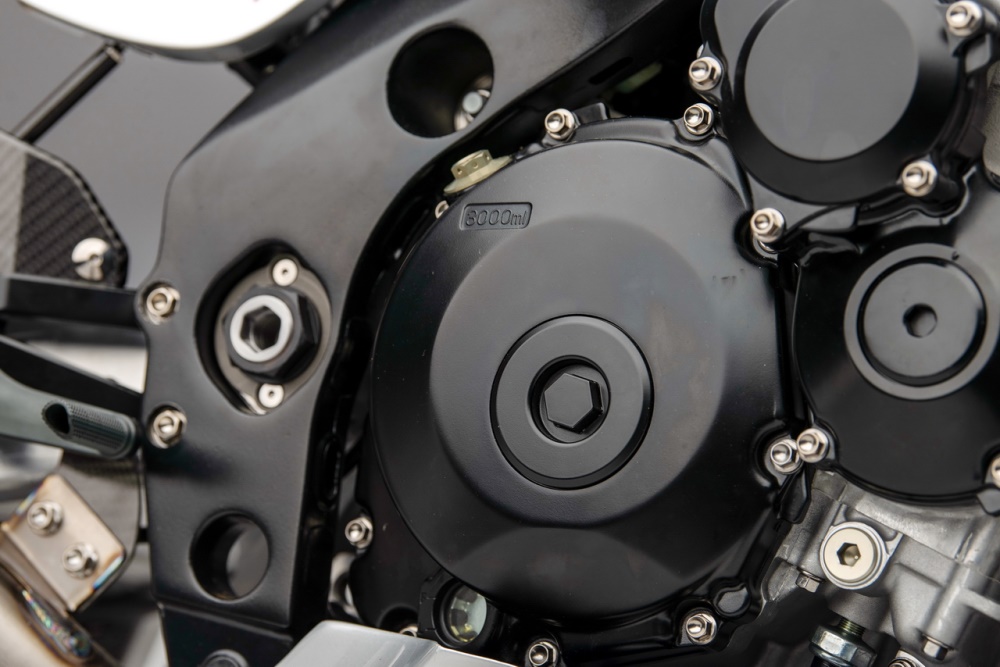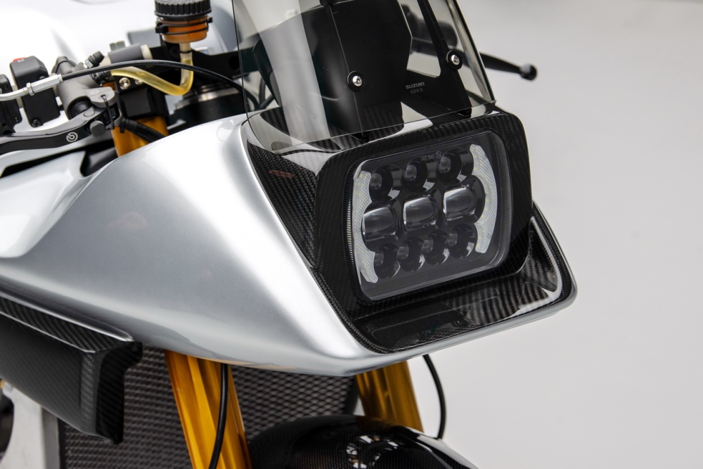 進(jìn)氣箱(空氣濾清器)也是來自 GSX-R1000R K8 工廠賽車,散熱水箱和潤滑油冷卻器也是來自工廠賽車同級的產(chǎn)品。由于 “ Suzuki 經(jīng)典車隊 ” 將該作品設(shè)定為可于公共道路上行走(注:英國當(dāng)?shù)卦试S對經(jīng)過特別程序、檢驗合格的車輛,掛牌上路),這臺 Katana 定制車采用了來自 Yoshimura 吉村的 EM Pro 發(fā)動機管理系統(tǒng)(電子燃油噴注系統(tǒng)的 ECU 和感應(yīng)器等組件)。