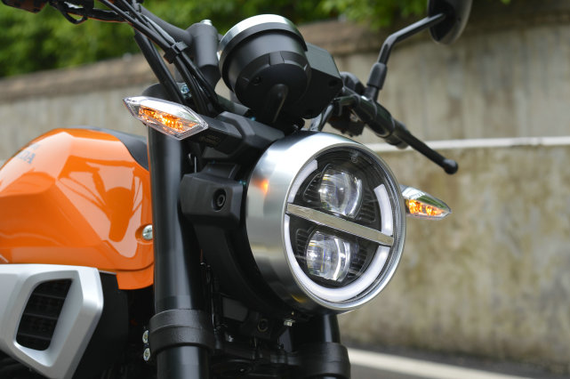 圓形頭燈是復(fù)古車型必不可少的設(shè)計(jì)特色,頭燈的布局能夠看到一些Neo Sports Cafe的影子,兩顆碩大的LED透鏡分別是遠(yuǎn)/近光燈,大燈周邊圍繞著乳白色的日行燈,鍍鉻的燈罩彰顯出復(fù)古的格調(diào)。