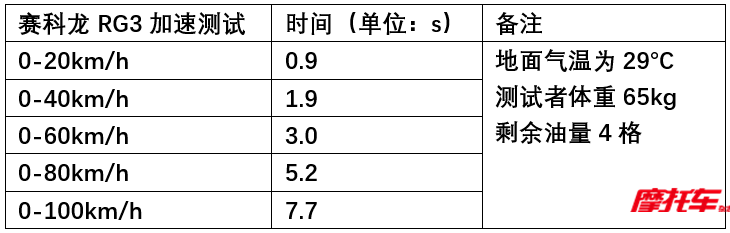 RG3在加速測試中并未發(fā)揮出全部實力,首先是最大功率和最大扭矩轉速偏高,且發(fā)動機一萬轉出頭就會斷油,在測試中很難抓到最佳換擋點,而且這樣的最大功率轉速對RG3來說在日常騎行中也基本不會用到。這臺車還裝配了車輛護邊箱、邊箱護杠等原廠改件,在半箱油的狀態(tài)下,整車重量也超過了220kg,再考慮到風阻的因素。0-100km/h加速7.7s算是一個不錯的成績了,尤其是0-60km/h這種起步加速成績?yōu)?s,在同級別中表現(xiàn)也較為優(yōu)秀,有一些運動的感覺了。而且作為一款運動旅行車來說,動力輸出線性比動力水平更重要,RG3在這方面表現(xiàn)不錯,由于其發(fā)動機轉速調性,使得RG3在動力上也擁有很好的高速延展性。