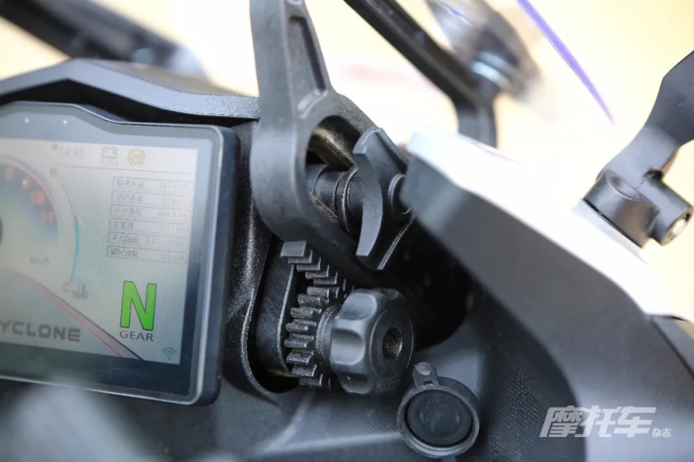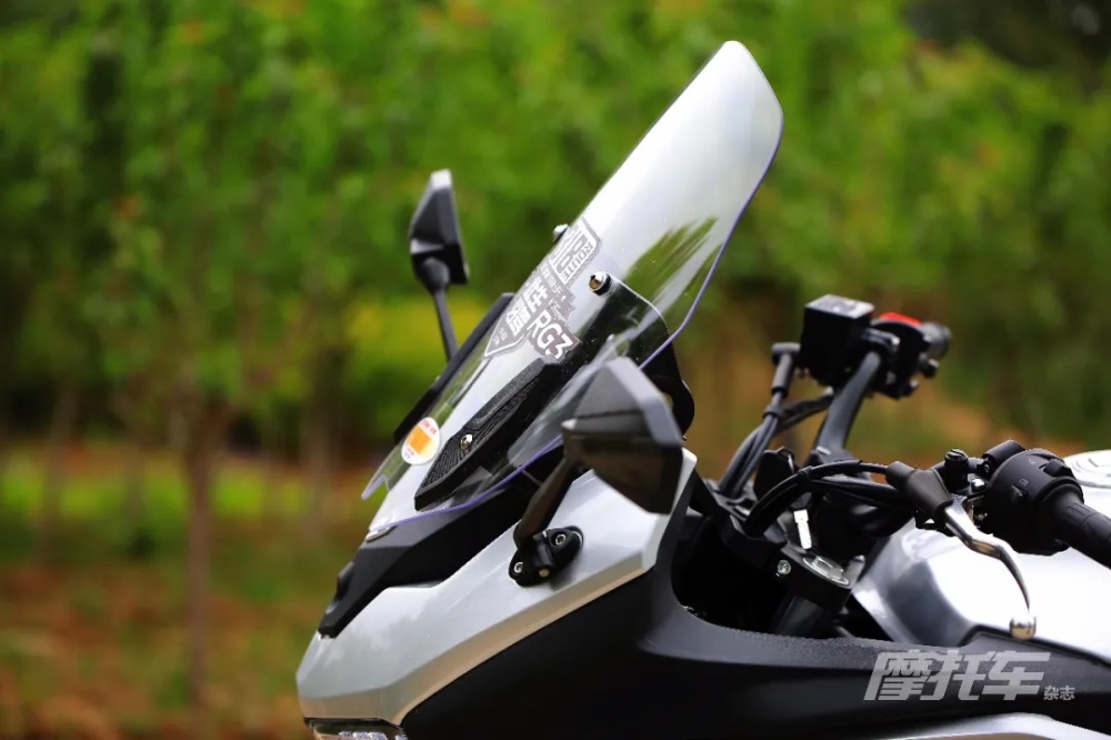 除此之外,RG3的換擋桿也有著設計人員的巧思,橫桿位置有前后兩個孔位可調,方便不同腳長或者鞋型的騎手找到適合自己的擋桿長度,這個人性化設計在國產車中非常少見,必須好評。風擋面積中規(guī)中矩,角度略小且頂部導風作用不明顯,對于175cm以上的騎手來說沒有頭部風阻保護。另外風擋的結構設計有欠考量,風擋升降結構較為繁瑣,需要先擰松兩側鎖緊旋鈕,再通過另外兩個齒輪旋鈕通過與風擋的齒合來控制升降,操作也并不方便,有些多此一舉,這里完全可以只保留滑動結構和鎖緊旋鈕,結構更簡潔同時也是成本更低的做法。
