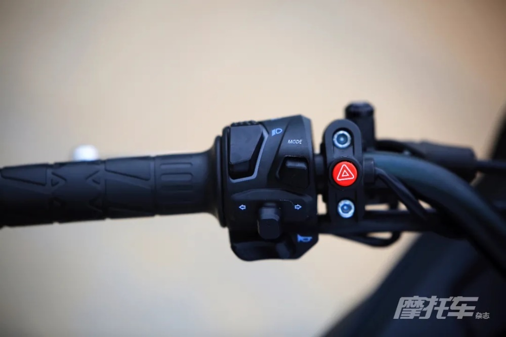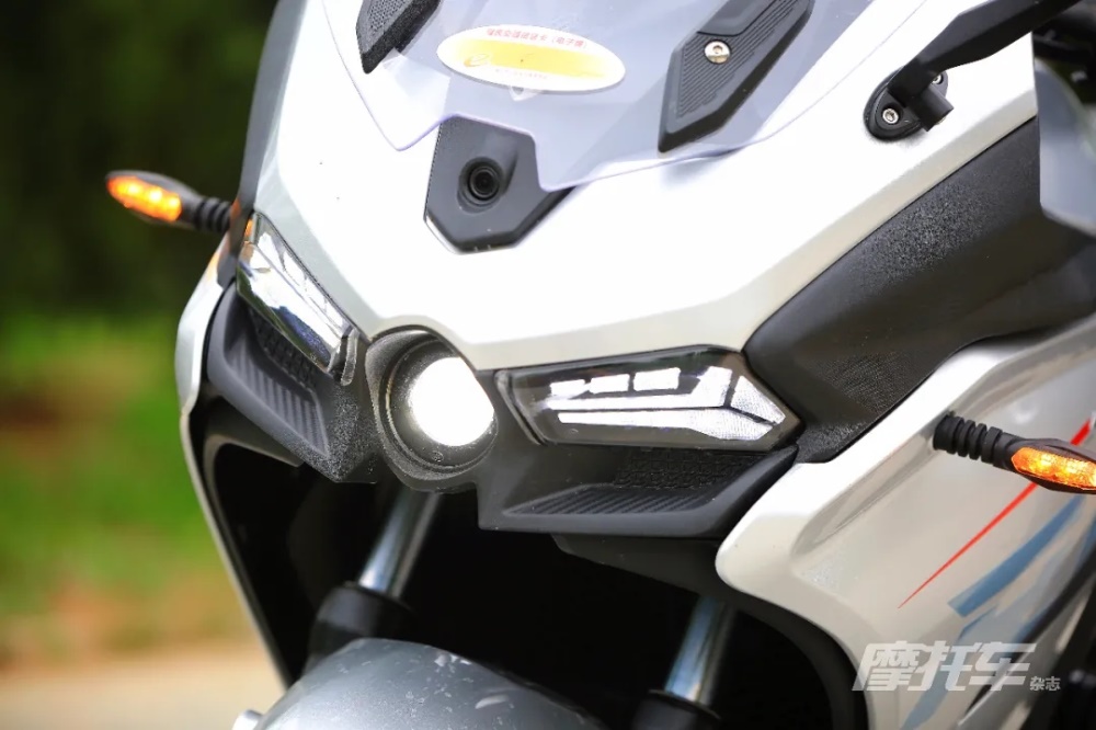 車頭部分的燈組設計較為銳利,官方稱之為“龍吐珠”,兩側是組合式日行燈,中間則是遠近光共用圓形透鏡的分層式大燈,其中大燈這部分的設計非常像頂級運動旅行車H2 SX。燈光部分有一個很不錯的配置,將右手把上的燈光開關撥到自動位置后,車輛便可根據(jù)環(huán)境亮度自動開啟遠近光燈和手把背光,十分人性化,同時這套光感還可以關聯(lián)儀表,同樣可以根據(jù)環(huán)境調節(jié)亮度及切換日夜間模式。