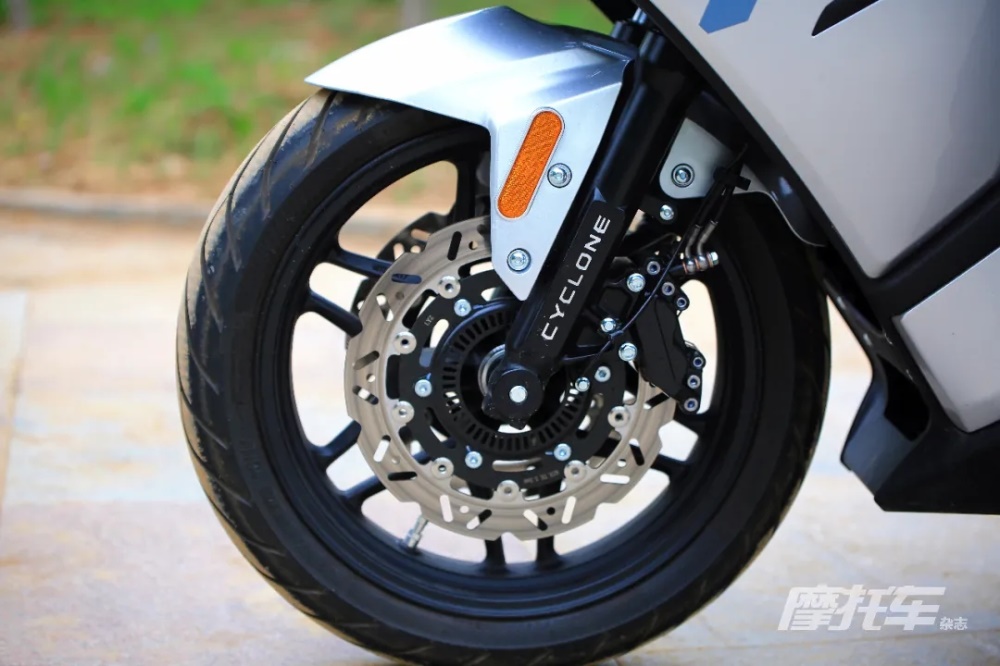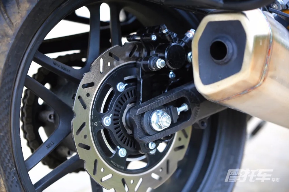 減震系統(tǒng)為正立式前叉搭配中置后減震,后減震支持阻尼調節(jié),不過調節(jié)位置較為隱蔽。這款車雖然有很多對于旅行上的優(yōu)化,但騎起來運動的感覺同樣明顯,特別是體現(xiàn)在減震上。整車減震系統(tǒng)的調校偏向運動化,前減震表現(xiàn)尚可,制動時車頭不會過分下壓,通過障礙時減震的反饋也相對柔和。但后減震則更多地考慮了支撐性和載人載物的情況,彈簧預載較硬且回彈阻尼不明顯,后輪通過減速帶時震感非常明顯,這一點表現(xiàn)無論是單人或者是雙人騎乘,在舒適性上都有所欠缺。
