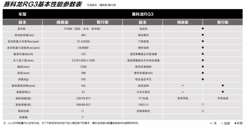 運動旅行車此前在市場中認可度并不算高,究其原因可能還是定位比較模糊,只能去討好兼顧運動外觀和中短途旅行需求的小部分人群。前兩年也有春風在這一細分市場投放了400GT,但反響平平。今年賽科龍再次推出了RG3,在一些配置和科技屬性方面有了更多進步,加上國內道路路況越來越好,有望能夠吸引更多的關注。不過在今年的背景下,Honda 400X的到來也會在這一市場中爭奪蛋糕,RG3在售價方面與其拉開了差距,同時配置上更豐富;400X貴了幾千元且有“本田大法”加持。如果RG3能進一步增加配置差異化,例如加入手把加熱、座椅加熱等旅行屬性的配置,可能會更加從容。