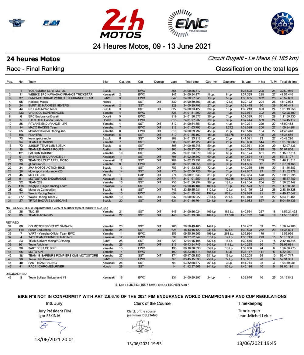 最終,1 號車的 Yoshimura SERT 車隊(duì)成功奪得了本站比賽的勝利,跑出的總里程為 855 圈,累計(jì) 24 次進(jìn)站。而在 855 圈里面,其中的 819 圈、他們都處于領(lǐng)先的位置(以剛沖過終點(diǎn)的那一刻計(jì)算)上。