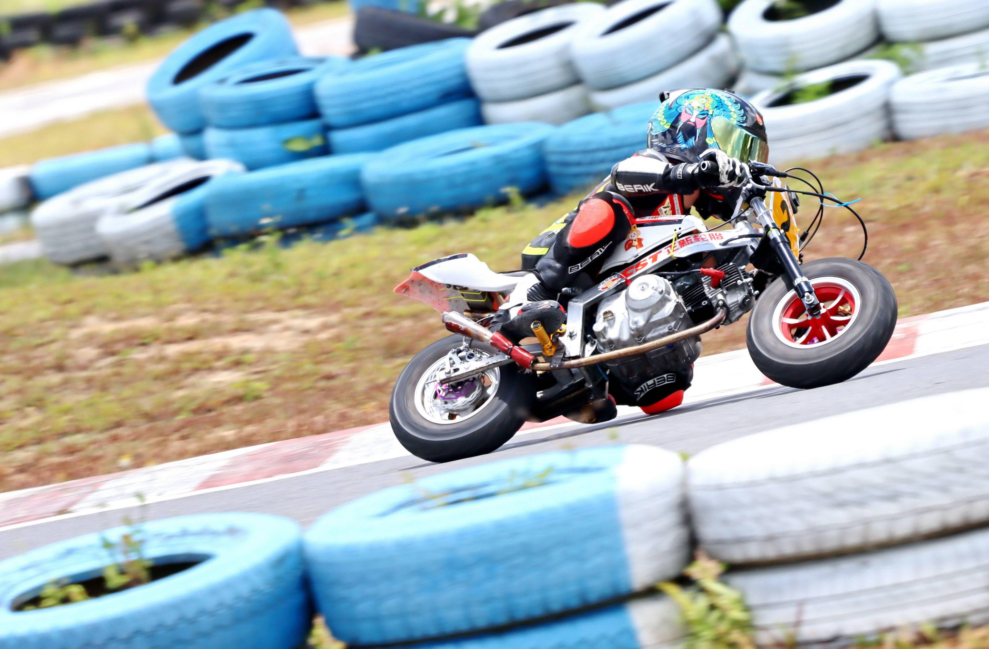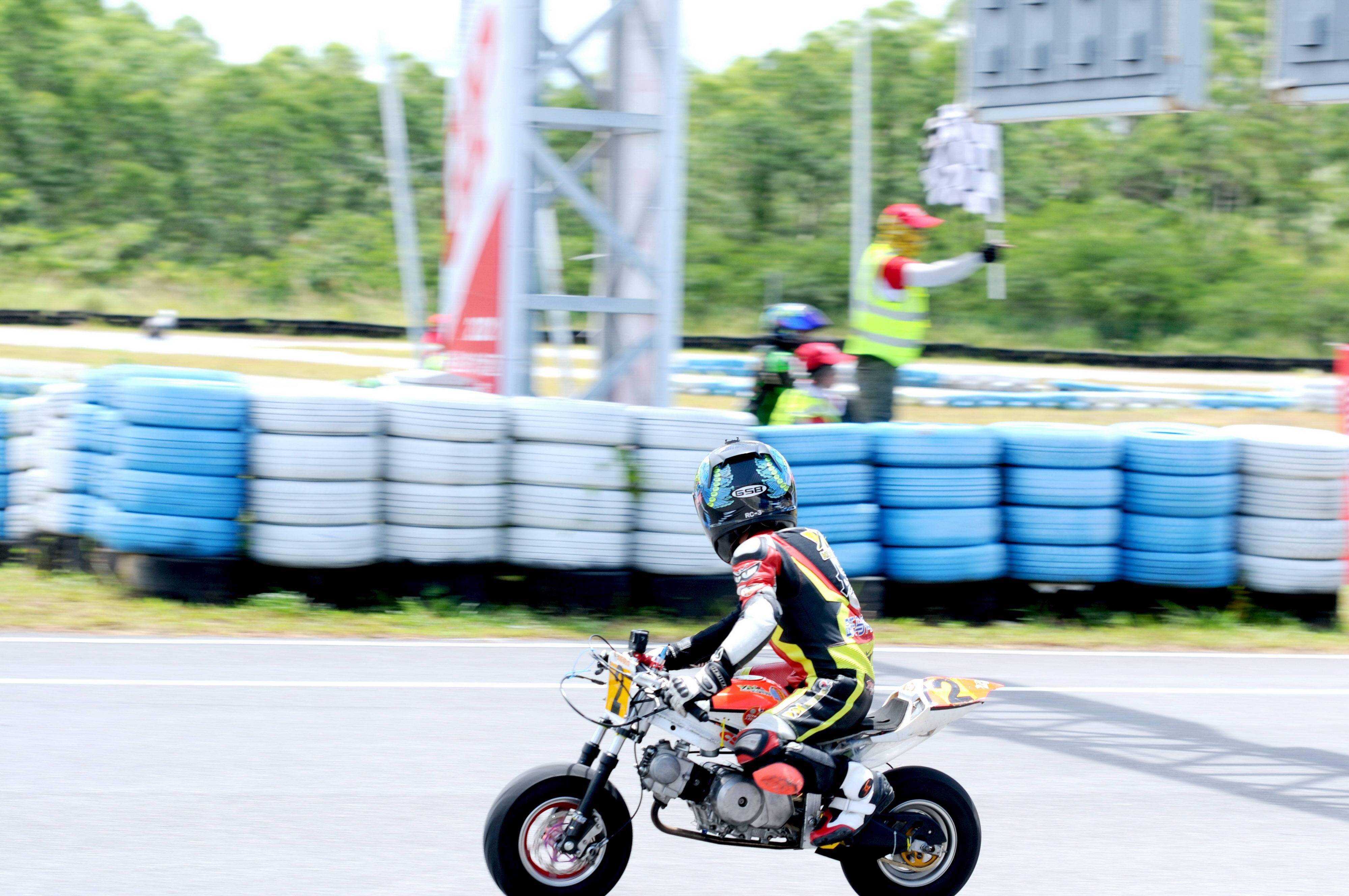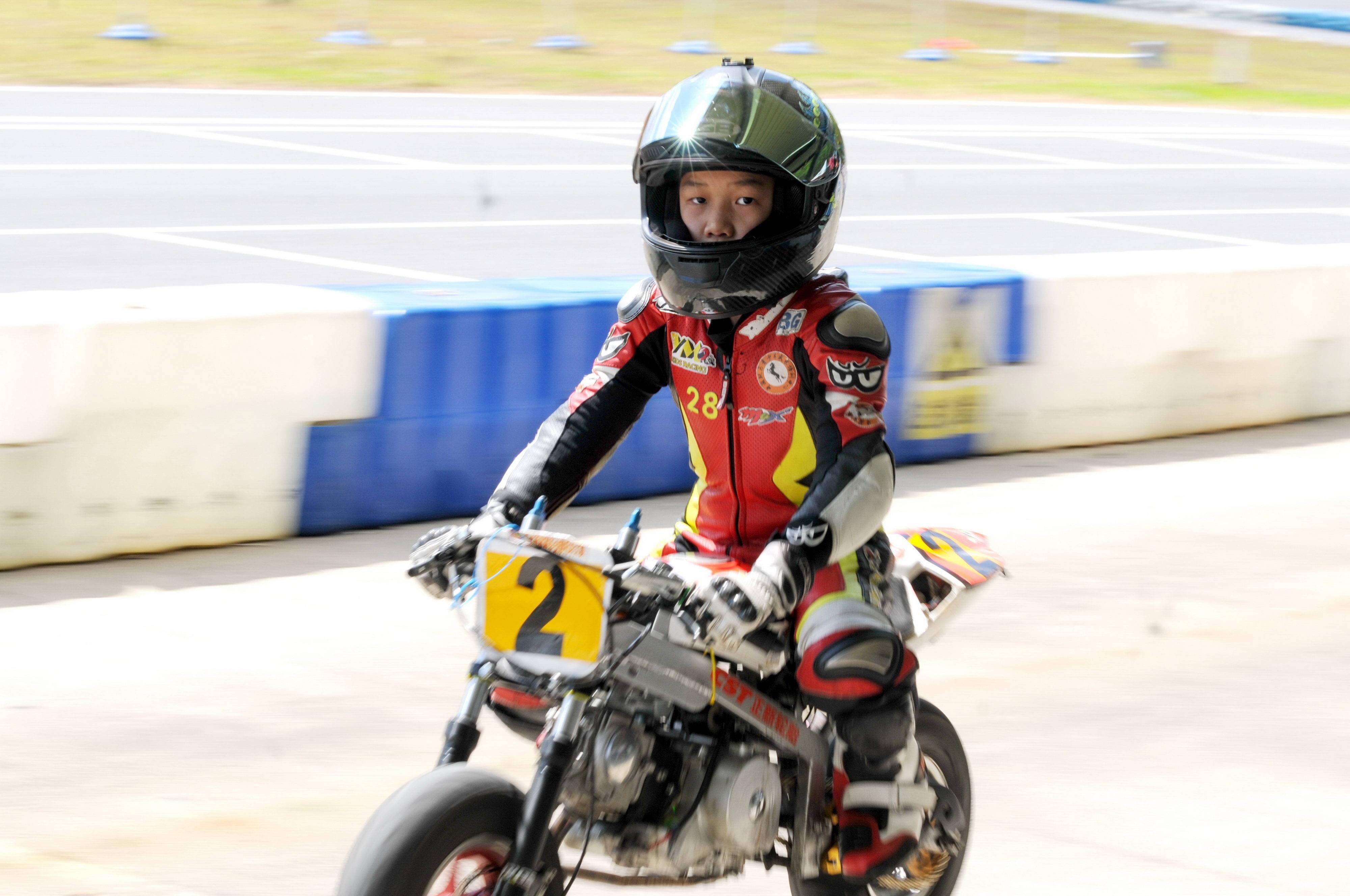 決賽二、更是一場白熱化的競爭,最后沖線時,韓斐然以大約 0.6 秒的優(yōu)勢獲勝,并以兩節(jié)全勝的姿態(tài)、奪得了本站比賽的小童 B 組冠軍。對于一臺車輪直徑限制在 8 英寸以下、發(fā)動機限制為單氣缸兩氣閥、排氣量在 57 cc 以下的賽車來說,僅僅是大約 0.6 秒的差異,其競爭的激烈程度、可見一斑。