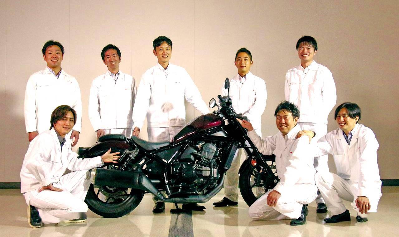 下面的圖片,Rebel 1100 項(xiàng)目開發(fā)組:站立者、左起,小數(shù)賀巧(商品性研究)、野野山佑也(操縱安全研究)、古瀨博(LPL,大項(xiàng)目負(fù)責(zé)人)、辰巳貴?。y(cè)試負(fù)責(zé)人/項(xiàng)目代理負(fù)責(zé)人)、飯干慎也(燃料/吸排氣研究)。