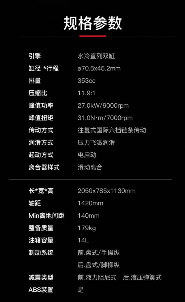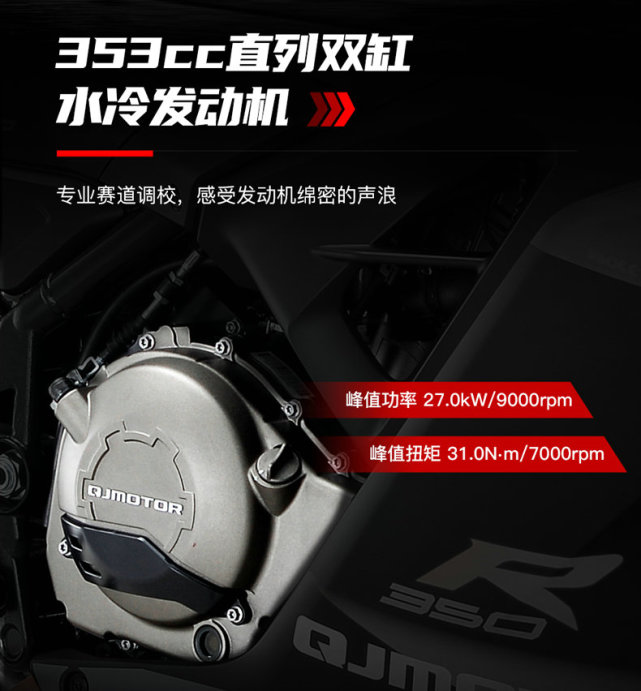 作為追350的同款車型,搭載同款353cc排量雙缸水冷發(fā)動機,峰值功率達到了27kw(36.7ps),最大扭矩輸出為31Nm,而街車追350的零百加速成績?yōu)?.1秒,賽350的成績會不會更好,這里同樣可以期待一下。