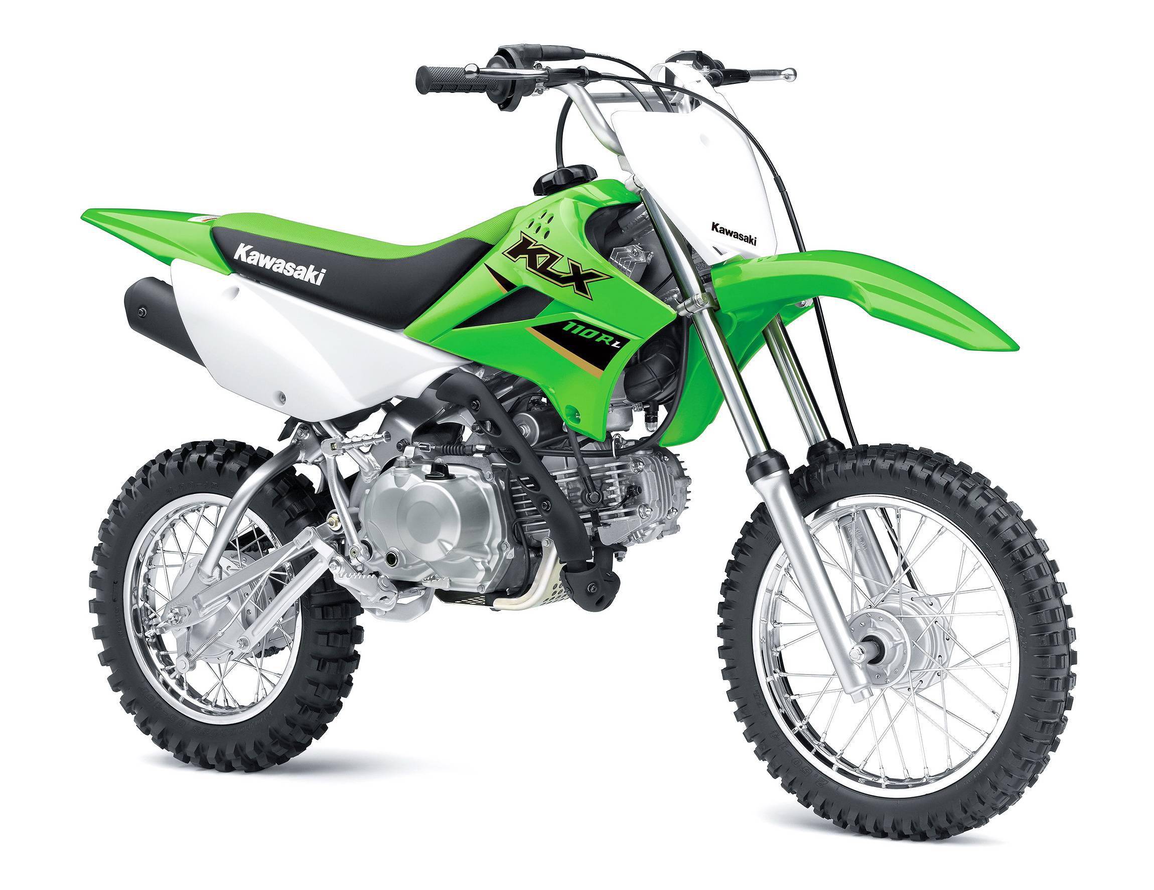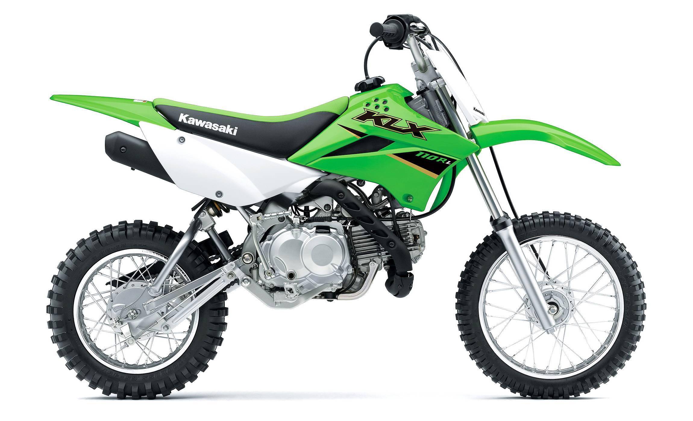 KLX110R L 搭載一副風(fēng)冷四沖程臥式單氣缸、排氣量 111 cc 的發(fā)動機(jī),采用了與彎樑車相同操作原理的半自動離合器、四檔的變速齒輪箱,標(biāo)配了電啟動裝置,前 14、后 12 英寸直徑的車輪,屬于小童的入門級越野練習(xí)車型。