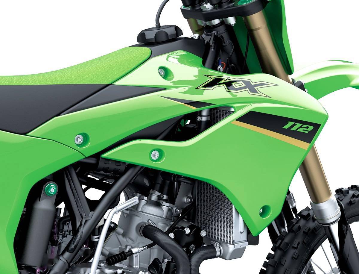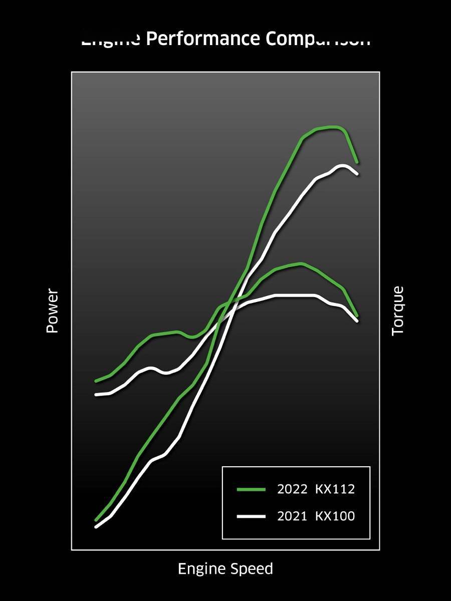 有著較大變化的車型是新型號的 KX112。該車搭載一副水冷兩沖程單氣缸的發(fā)動機(jī),從上一版本的 KX100 升級而來,缸徑、行程為 52.5 mm x 51.6 mm,排氣量 111 cc。而此前的 KX100 缸徑、行程為 52.5 mm x 45.8 mm,排氣量 99 cc。加長了的氣缸行程,意味著新車將有更好的低轉(zhuǎn)速表現(xiàn)。而六檔的變速齒輪箱,內(nèi)部齒輪組的變速比也經(jīng)過了調(diào)整。
