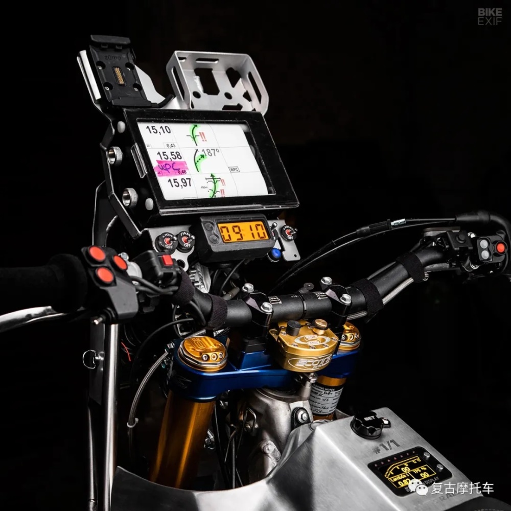 靈一個更明顯的附加功能是該車的導航塔(我們似乎更習慣稱它為“拉力頭“),車把上方有滾動的路書儀以及各種功能性的插槽,除了實用性之外,從視覺上來看也極為舒服。