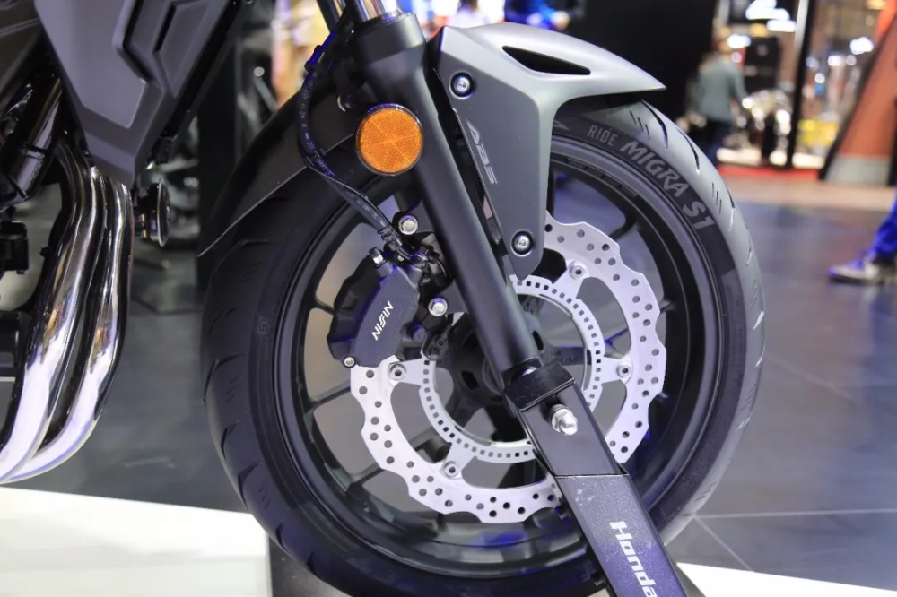 CB500X的輪胎選用了鄧祿普MIXTOUR多功能胎,前輪尺寸110/80 R19,后輪尺寸160/60 R17。CB400X則配置了正新的MIGRA S1半熱熔公路胎,前輪尺寸為更寬的120/70 R17,后輪尺寸160/60 R17。輪胎的選擇也能夠看出兩車在定位上的不同,CB500X有著19寸前輪和更高的離地間隙,搭配全地形輪胎可以應(yīng)付更多的路況。CB400X配備的半熱熔公路胎則是更多的顧及了鋪裝路面的抓地力和運(yùn)動(dòng)性,定位更偏向公路旅行。兩車在制動(dòng)方面采用基本相同的配置,都是NISSIN前單向雙活塞卡鉗與后單向單活塞卡鉗的組合,標(biāo)配ABS。