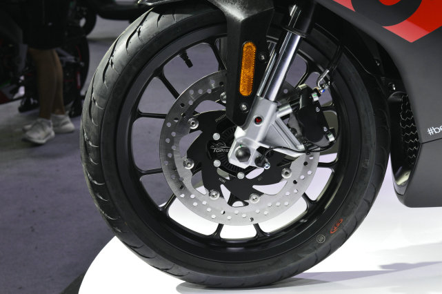 前制動(dòng)配備300mm單浮動(dòng)盤+對(duì)向四活塞輻射式卡鉗,倒立式前叉不具備調(diào)節(jié)功能。