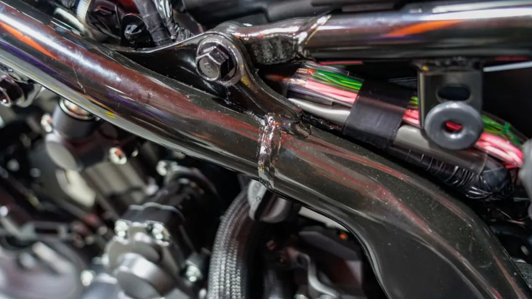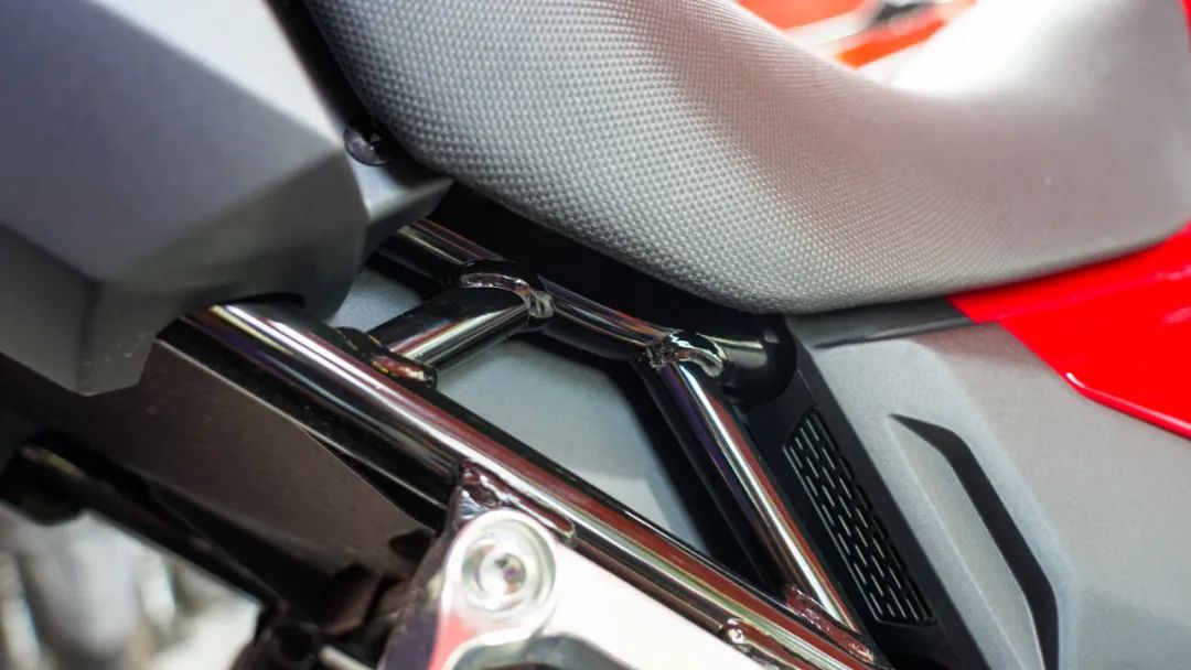 整體車(chē)架的焊接工藝也算得上中規(guī)中矩,雖然沒(méi)有達(dá)到魚(yú)鱗焊那種效果吧,但也什么明顯的槽點(diǎn)。
