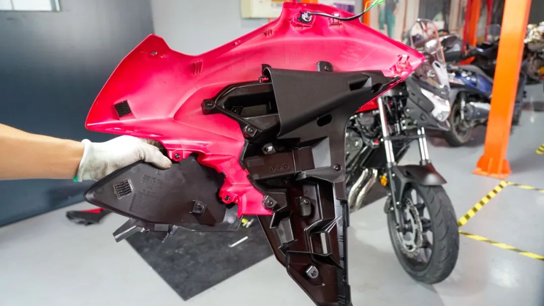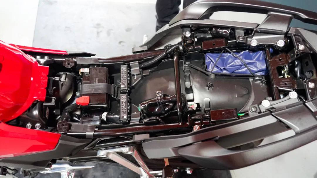 拆解第一步,打開(kāi)坐墊,你會(huì)看到非常規(guī)整的做工,所有部件按部就班,后尾燈以及后轉(zhuǎn)向燈的插頭都有固定位,工具包內(nèi)部配備了后減震調(diào)節(jié)工具,頭盔防盜繩以及保險(xiǎn)絲更換工具。