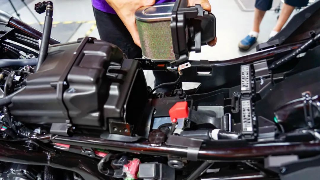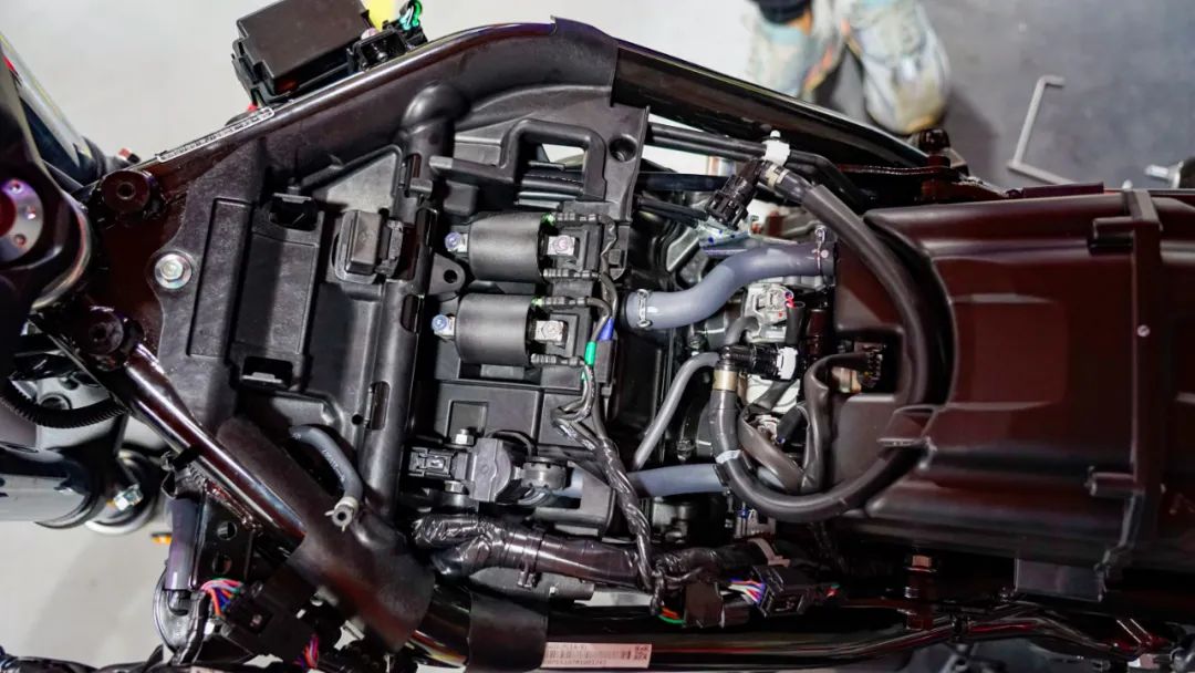 端下油箱之后我才發(fā)現(xiàn),原來(lái)這臺(tái)車(chē)更換空濾不需要拆油箱,只需要拿下坐墊,拆卸電瓶,擰松空濾上的四顆螺絲就能輕松拆卸和更換空濾了,這點(diǎn)對(duì)于用戶后期保養(yǎng)非常方便,至少可以省下點(diǎn)工時(shí)費(fèi)的錢(qián)拿去加油了,不香嗎?