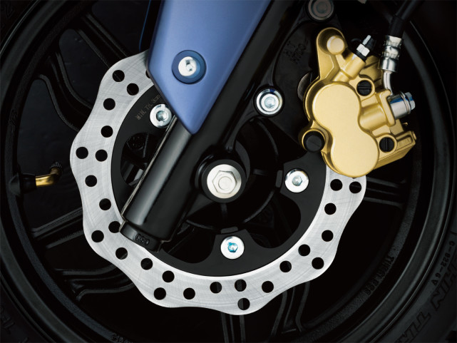 中規(guī)中矩的傳統(tǒng)正立式前叉,前剎車采用單碟盤+雙活塞的設計,并沒有什么出彩的地方。