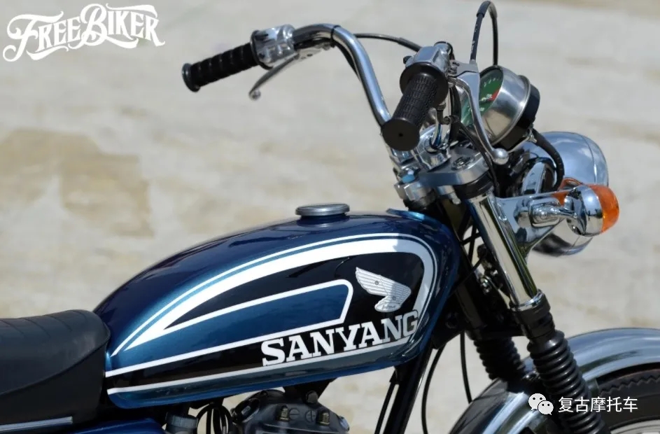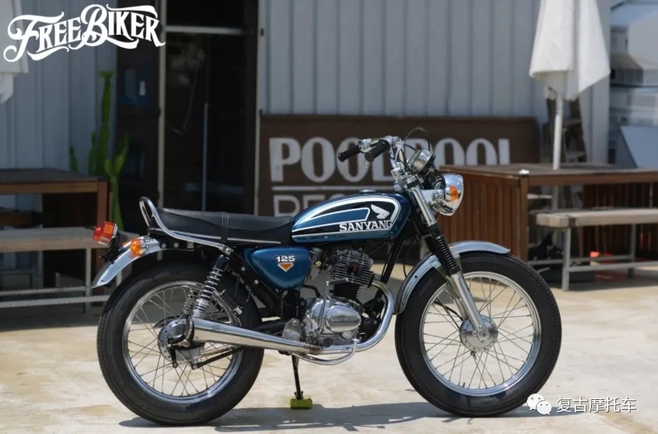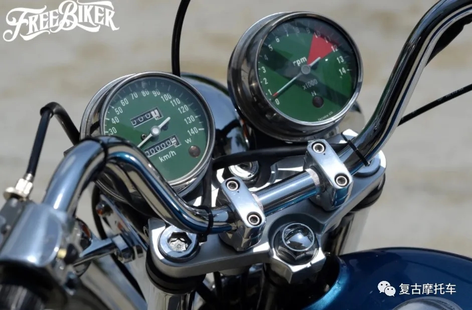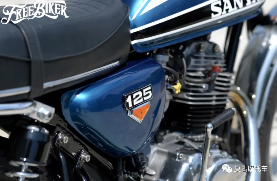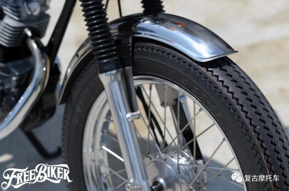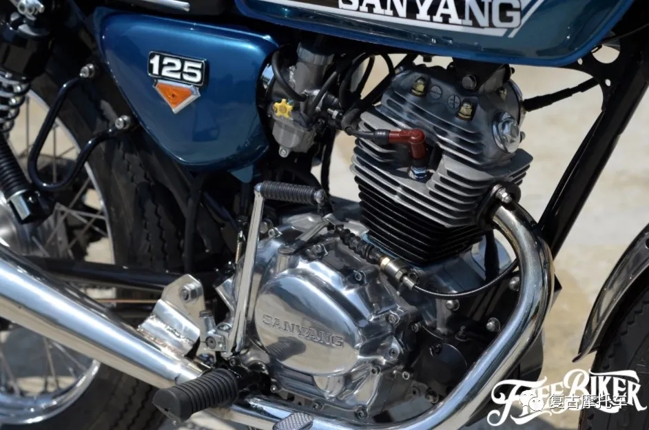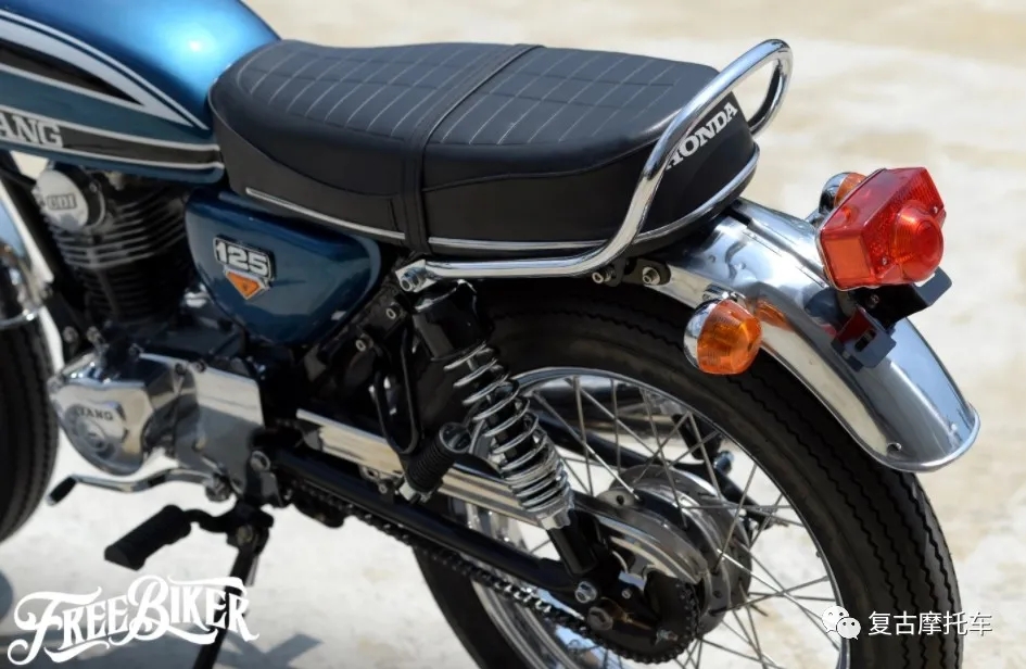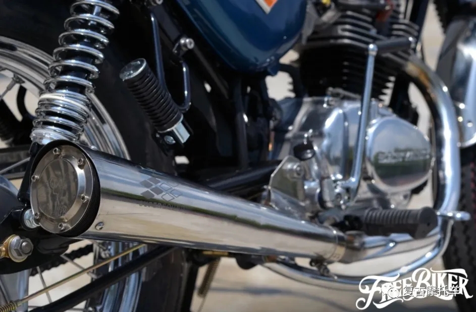 這部車的儀表、座墊和側蓋都是來自CB125而來,油箱、頭尾燈和前后擋泥板則是沿用老狼最初的配置。但是可不要以為這部車就只是換換零件這么簡單,其實在搖臂加長后,副車架也做了約7cm的延長,而CB125的側蓋更是經過加工才得以與野狼車架搭配。也因為車體被適當放大,因此前后輪也得以配上4.00-19、4.00-18的復刻胎。引擎當然也做了徹底翻新,在缸徑擴大后排氣量已躍升至近175cc,而變速箱移植上野狼R版零件后,這部車甚至還進化成五速國際檔!