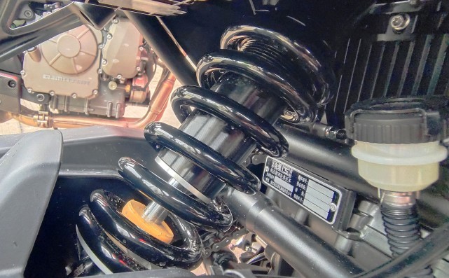 可調(diào)節(jié)的中置后避震,廠家宣稱采用賽道級別減震調(diào)校,不過個人感覺還是有點舒適性取向,不算太硬。