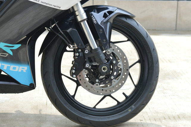 很多人關心賽350的前剎車,這次拍攝的雙碟版本,剎車規(guī)格為250mm雙浮動盤,配對向四活塞固定卡鉗。
