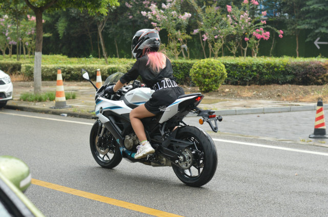 為了更好的展現(xiàn)賽350的騎行姿態(tài),在小姐姐試駕的時候偷偷拍了幾張,從騎行三角上看,賽350的坐姿略有前傾,但并不算特別的戰(zhàn)斗。
