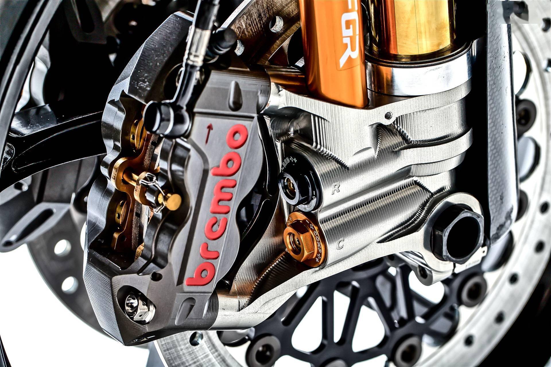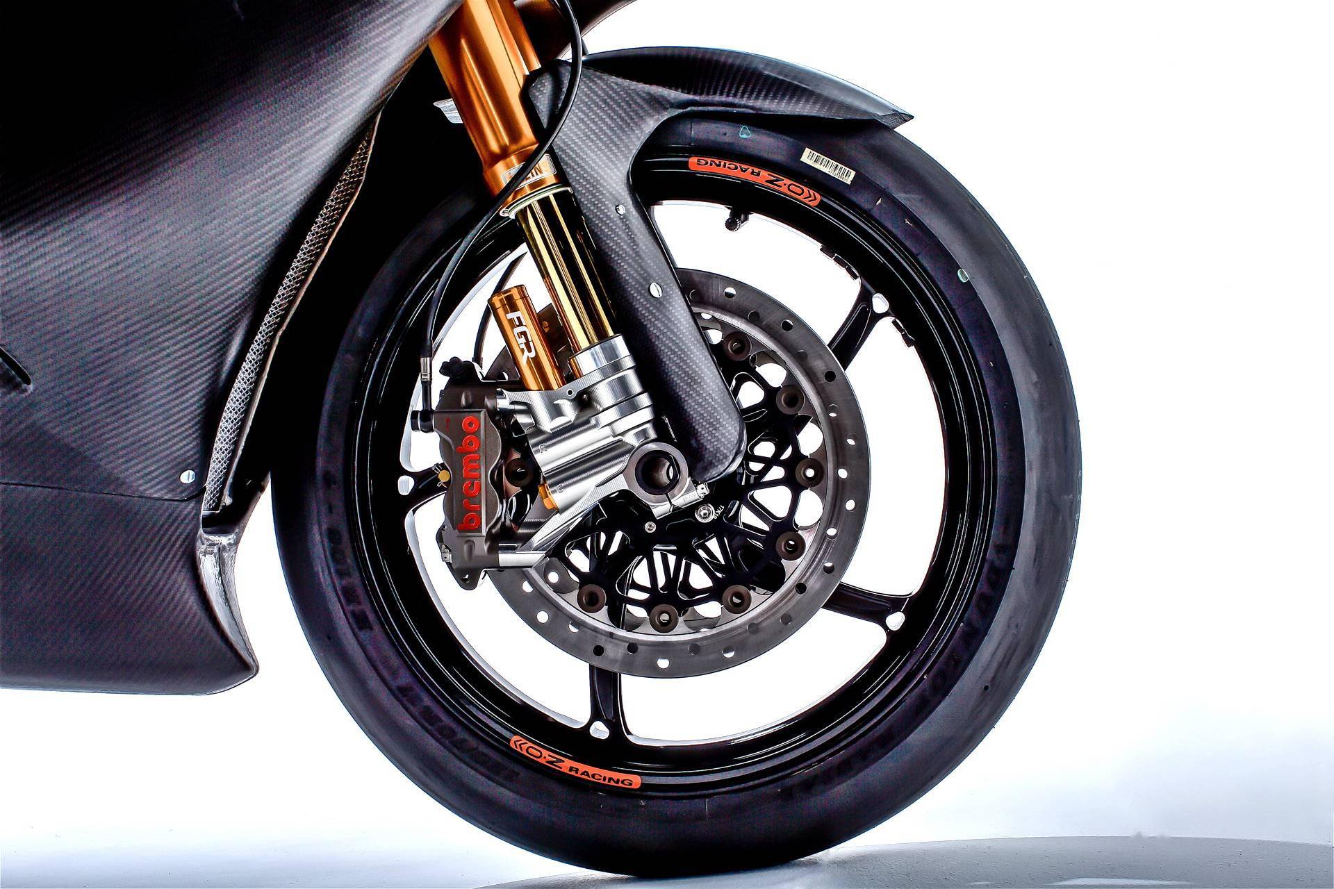 其他的部分,采用了來(lái)自 Ohlins 奧林斯的前后懸掛系統(tǒng),全碳纖維復(fù)合材料制的整流罩,CNC 加工而成的上下三星(前叉三角臺(tái)),i2M 的賽車(chē)儀表板,OZ 的前后賽車(chē)級(jí)輪框,Brembo 布博的 CNC P4.30/34 剎車(chē)卡鉗,容量為 19 公升的鋁合金手工制油箱。全車(chē)重量不到 140 公斤,而量產(chǎn)型的 CBR600RR,干燥重量為 156.5 公斤、整備重量為 186 公斤(2019 美國(guó)版)。