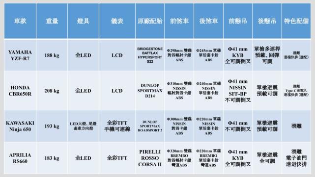 在原廠配胎與軸距方面,YZF-R7與RS660同樣由于較為強(qiáng)調(diào)賽道使用,因此配置也比其他兩臺(tái)對(duì)手更加運(yùn)動(dòng)化,而RS660更以鋁合金車架的設(shè)置,擁有本次集評(píng)中最輕盈的裝備重量。座高方面,由于YZF-R7與RS660為了對(duì)應(yīng)運(yùn)動(dòng)化的騎乘而偏高,因此建議有興趣但擔(dān)心腳無(wú)法平穩(wěn)踏地的車友們,在正式上市后到經(jīng)銷商進(jìn)行試跨。而NInja 650便沒(méi)有這樣的問(wèn)題,由于整體強(qiáng)調(diào)舒適調(diào)性,因此不僅手把較高,座高也為本次集評(píng)中最低。