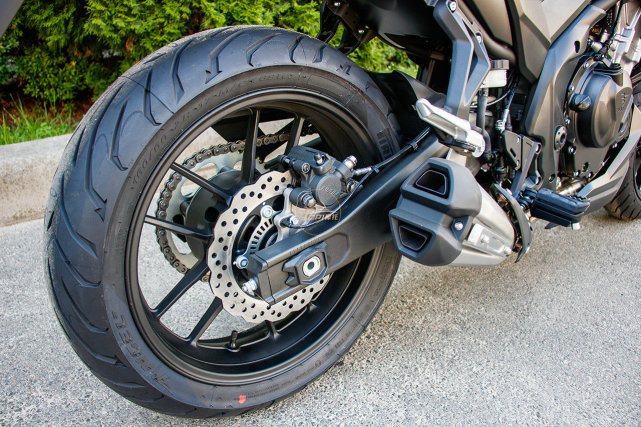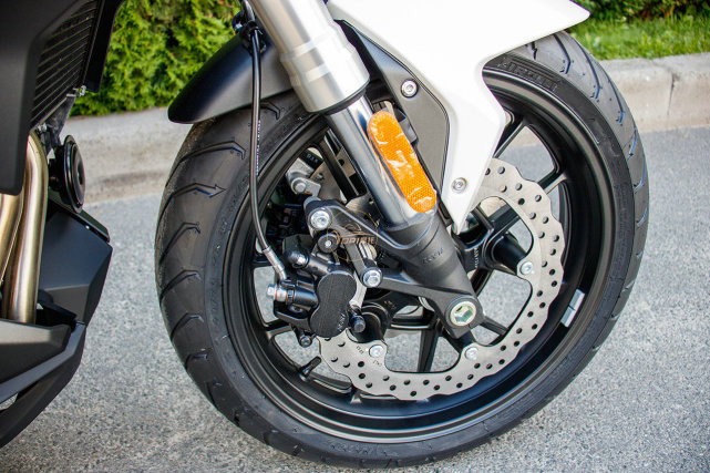 后剎車規(guī)格,240mm單制動盤,Nissin單活塞剎車卡鉗,輪胎方面由倍耐力提供Angel GT輪胎,前輪120/70-17,后輪尺寸160/60-17。