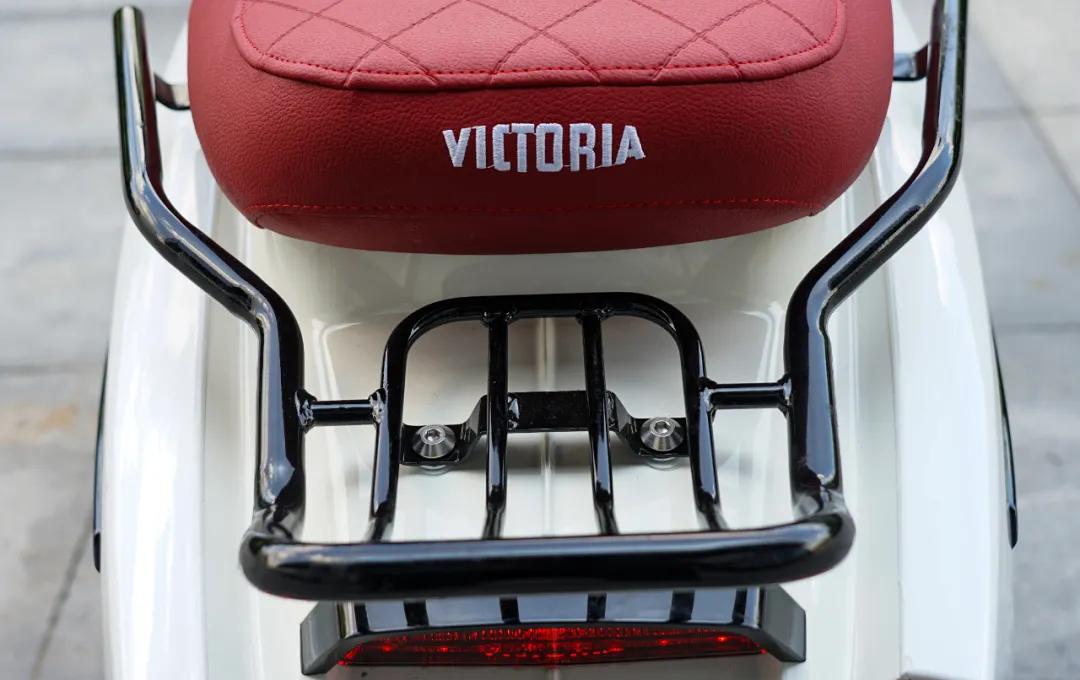 維多利亞 Sixties 150i原廠也配置了非常牢固的后貨架,兼顧造型的同時(shí),也非常實(shí)用,買(mǎi)買(mǎi)菜放放快遞什么的,坐個(gè)人都沒(méi)什么問(wèn)題,不過(guò)我們并不提倡這種危險(xiǎn)行為。