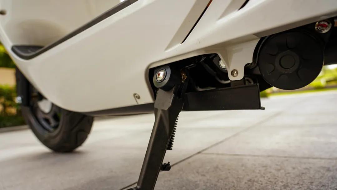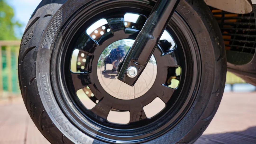 減震方面,因?yàn)槭蹆r(jià)關(guān)系,并未使用300上那一套KYB減震,前正置減震不可調(diào),后雙減震多級(jí)預(yù)載可調(diào),輪胎方面依舊是滕森品牌輪胎(批次不同也有使用正新品牌輪胎的),前后尺寸均為120/70/12,前輪轂還做了一個(gè)鍍鉻裝飾罩,凸顯復(fù)古格調(diào),不過(guò)沒(méi)有使用和300一樣的白邊復(fù)古胎,略顯遺憾。