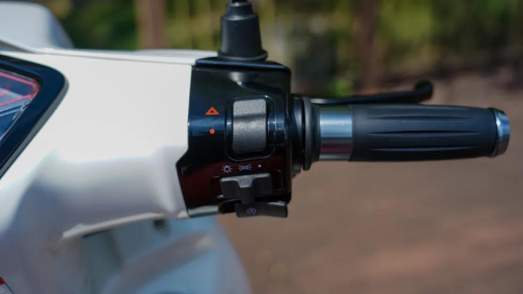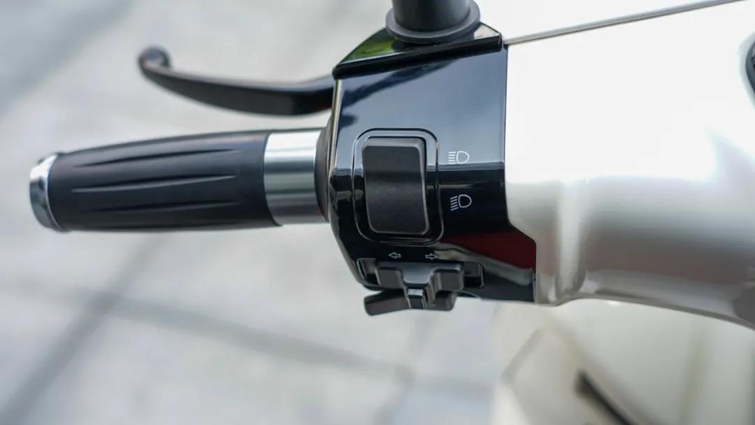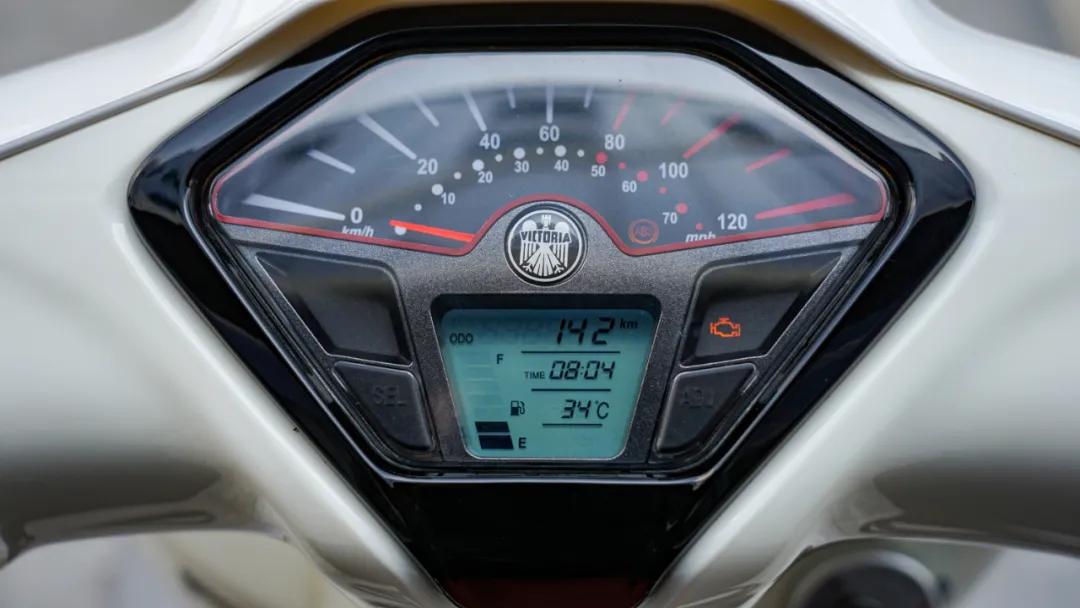接著我們來(lái)看車(chē)輛的儀表臺(tái)部分,儀表與維多利亞 Sixties 300i一樣,是一塊機(jī)械加液晶的組合式儀表,儀表內(nèi)容還算豐富,居然還能顯示年份和日期,現(xiàn)在這個(gè)年代,沒(méi)有配備TFT儀表比較遺憾,好在一輛復(fù)古車(chē)也不會(huì)太最求這些,開(kāi)關(guān)部件也與300一致,原廠配備的雙閃開(kāi)關(guān)算是一個(gè)亮點(diǎn),而且按鍵手感比通用件要好一些。