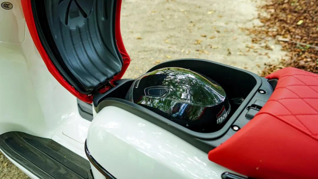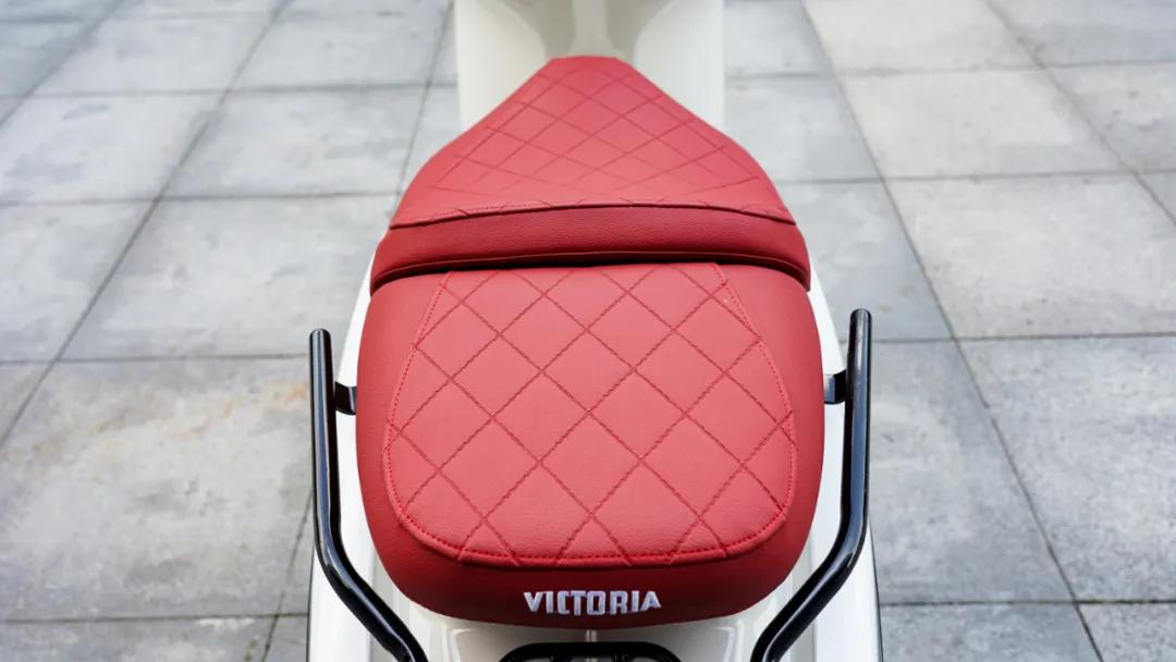 座椅部分采用了分體式設(shè)計(jì),座墊上的“假”縫線設(shè)計(jì)以及座墊后部的VICTORIA的立體刺繡logo,使得整車(chē)質(zhì)感及檔次更佳,由于采用了底置油箱的設(shè)計(jì),后座下方的空間用來(lái)安置車(chē)輛的電瓶部分,這也使得座桶空間被壓縮,略顯局促,經(jīng)過(guò)實(shí)測(cè),座桶內(nèi)只能放下復(fù)古半盔以及一些較小的3/4盔,全盔的話就別想了,不過(guò)也很少有人戴全盔騎復(fù)古踏板吧!