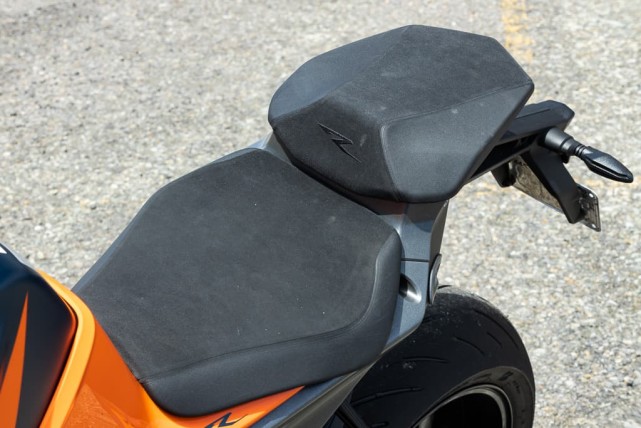 雖然這是一臺(tái)超級(jí)街車,但是在坐墊的面積以及設(shè)計(jì)方向來看,它還是有所兼顧舒適性的,還有后座前端類似腰靠的設(shè)計(jì),都能看出來雖然超級(jí)公爵很暴躁,但是它并不想讓你的屁股難受。