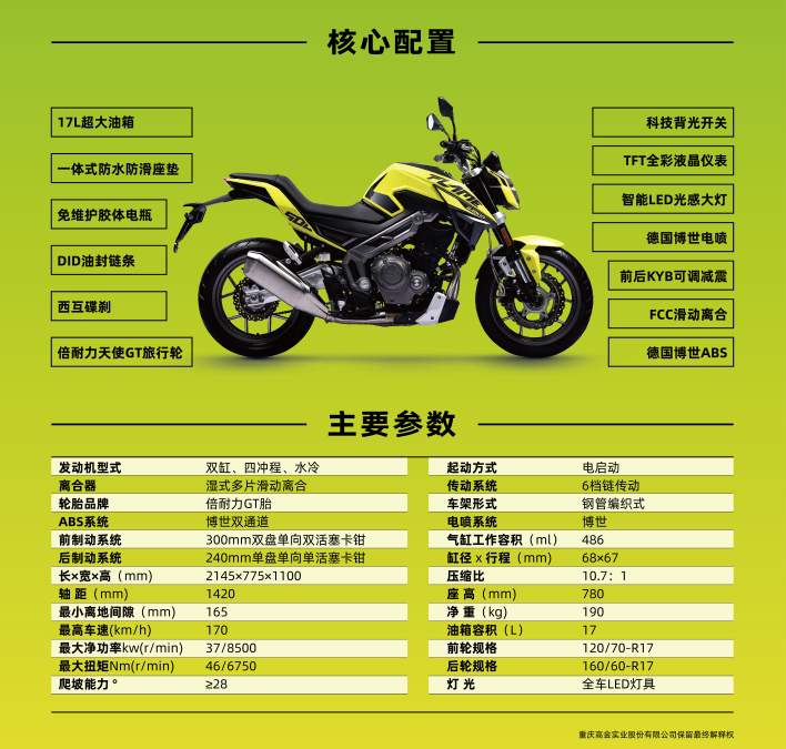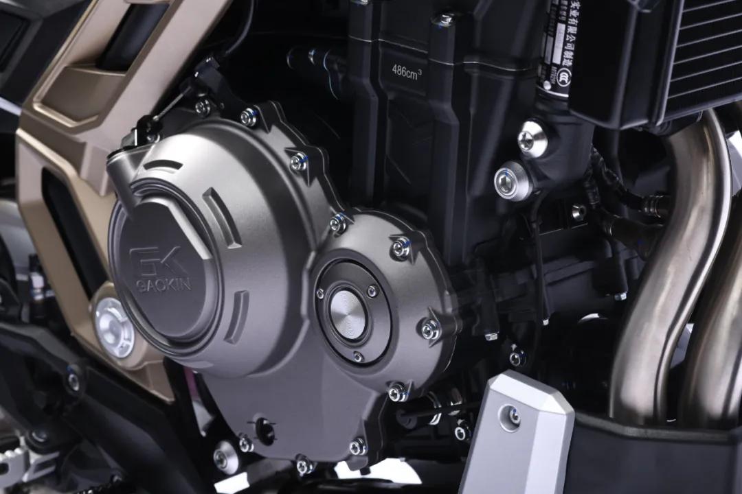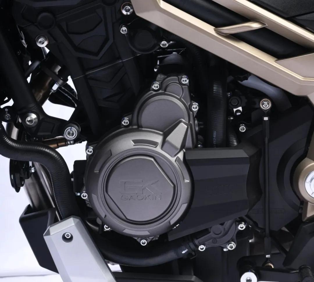 新車的發(fā)動(dòng)機(jī)部分,搭載的依舊是那臺(tái)高金自研的實(shí)際排量為486cc的直列雙缸水冷發(fā)動(dòng)機(jī),最大功率37kw/8500轉(zhuǎn),最大扭矩46N.m/6750轉(zhuǎn),并且配備有原裝進(jìn)口FCC滑動(dòng)離合,這臺(tái)發(fā)動(dòng)機(jī)的穩(wěn)定性已經(jīng)在高金自家的GK500上得到了驗(yàn)證,并經(jīng)歷了10萬公路路試驗(yàn)證,動(dòng)力輸出以及發(fā)動(dòng)機(jī)平順性方面不用擔(dān)心。