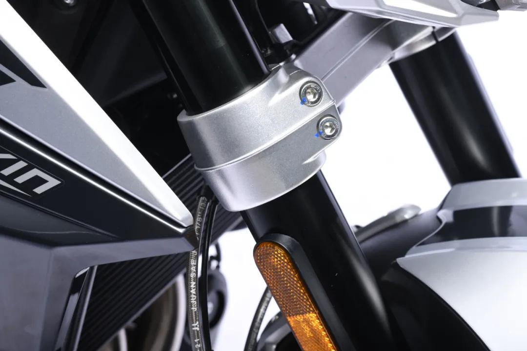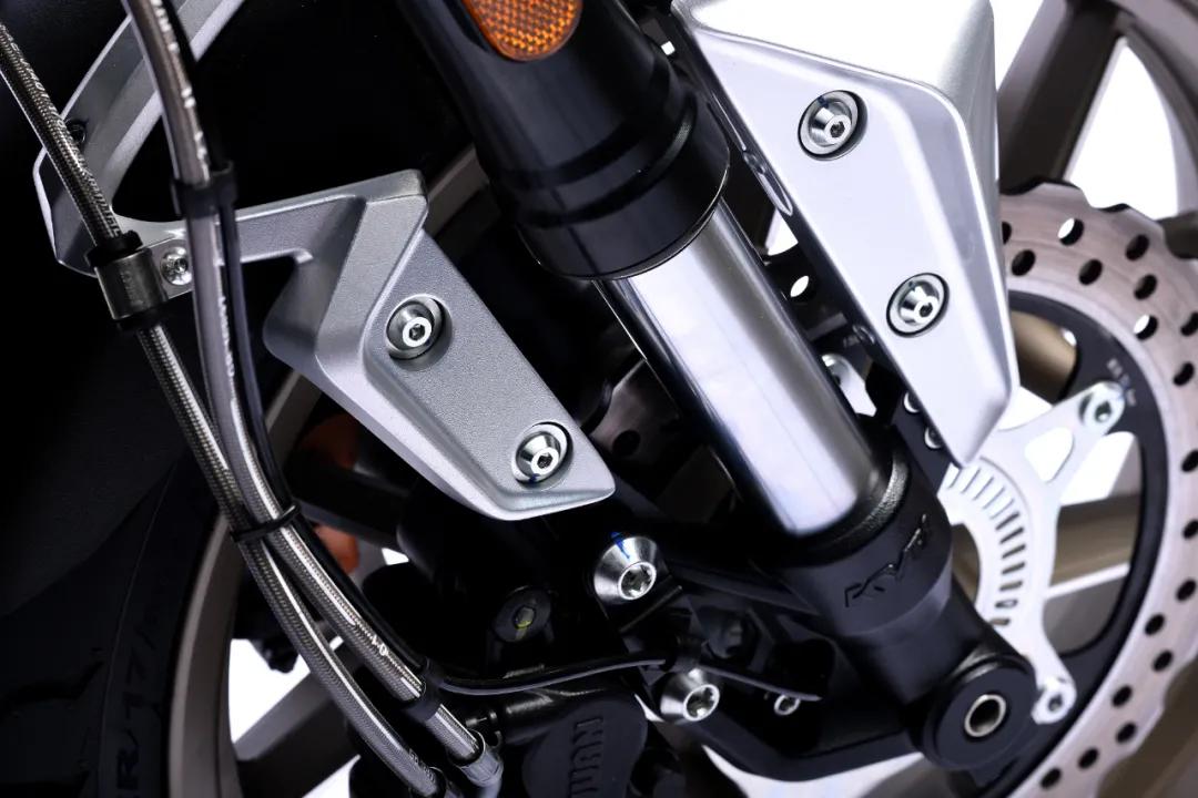 減震部分,F(xiàn)LAME500前減震為一對(duì)倒置KYB減震,具有多段可調(diào)功能,值得注意都是,新車的上下聯(lián)板均采用了鋁合金材質(zhì),強(qiáng)度更高且相較于鐵質(zhì)重量也更輕。