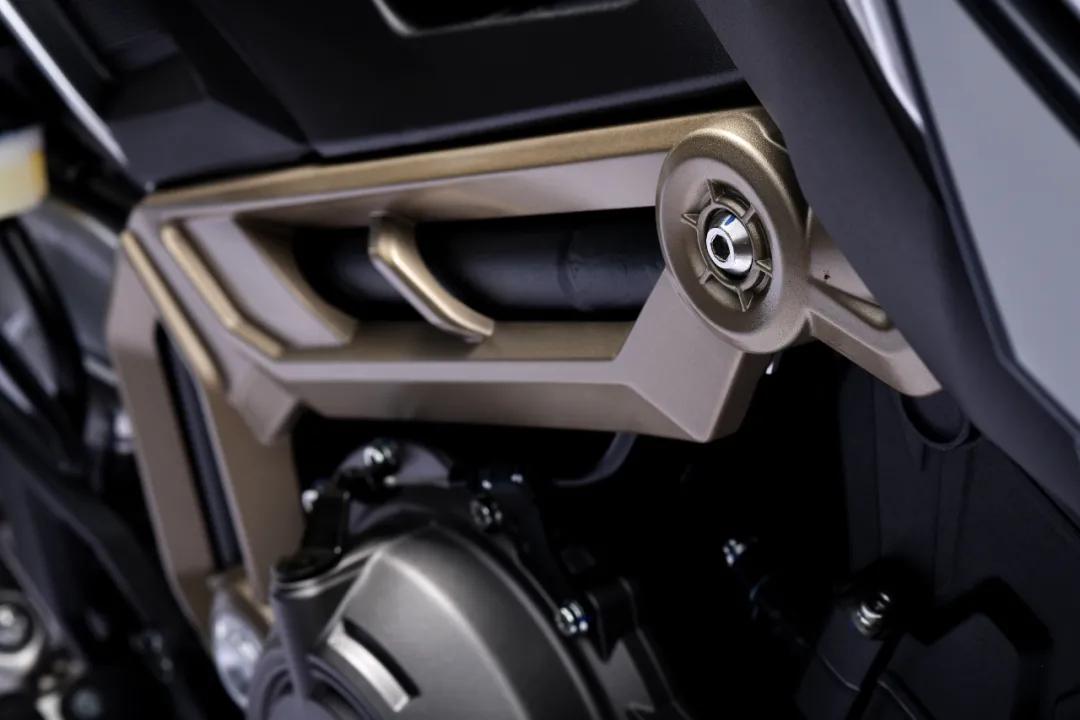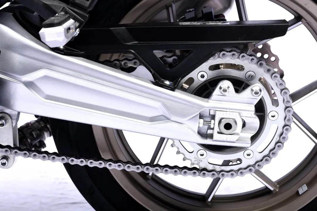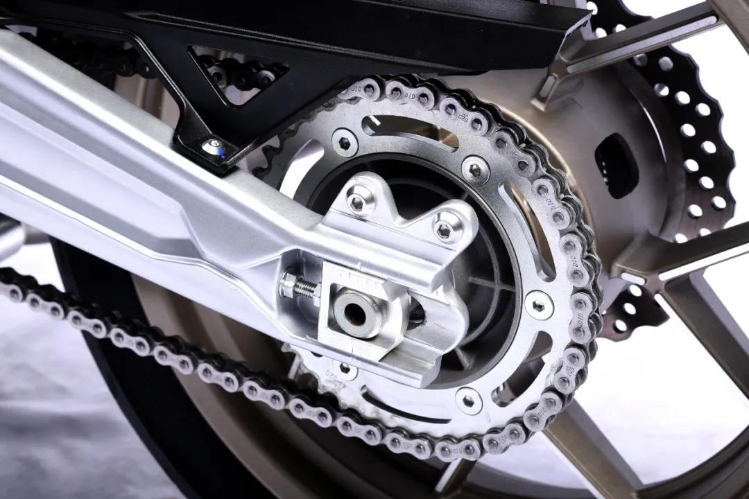 從車架延伸至后部的鋁合金后搖臂也非常亮眼,整個(gè)鋁合金后搖臂是中空鑄造一體成型,可以有效減輕簧下質(zhì)量且強(qiáng)度更高,直接反映給車手的就是整車操控會(huì)更加靈活,當(dāng)然,制造成本也相對(duì)較高,這里高金還非常貼心的預(yù)留了后輪部擋泥瓦的安裝位置,原廠即配備DID油封鏈條,從這幾點(diǎn)不難看出高金是真的有用心在做車。
