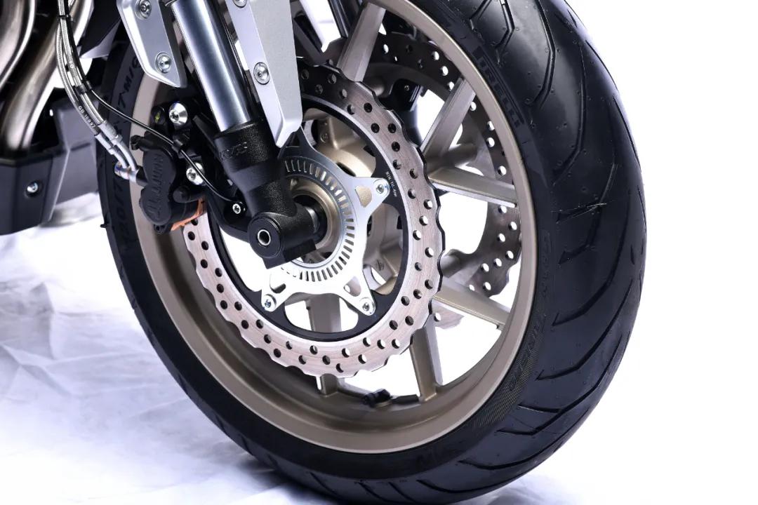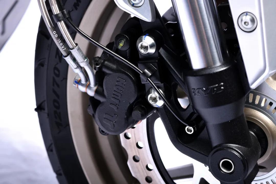 前后剎車均采用了西互品牌,而且這次還“增”配了!前雙碟剎配合兩個(gè)單向雙活塞卡鉗以及大直徑的半浮動(dòng)剎車盤,原車即配備剎車鋼喉。