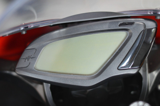 單色的液晶儀表盤,到底該不該吐槽?國外的Rosso版配備了最新的全彩儀表,就是不知道全彩儀表什么時候才能在MV Agusta車型當(dāng)中普及,畢竟也是售價超過20萬的車型了。這塊儀表顯示一些必要信息以及集成控制系統(tǒng) (MVICS) 的讀數(shù)。除了基本數(shù)據(jù)之外,還具有檔位顯示器、牽引力控制級別、ABS級別等等。