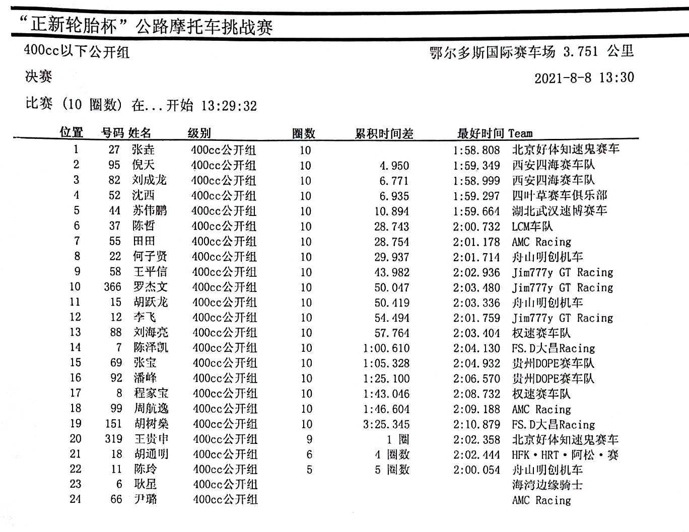 400 cc 以下公開組有 24 位參賽者報名。下面的圖片,是該級別的拼搶現(xiàn)場和成績。