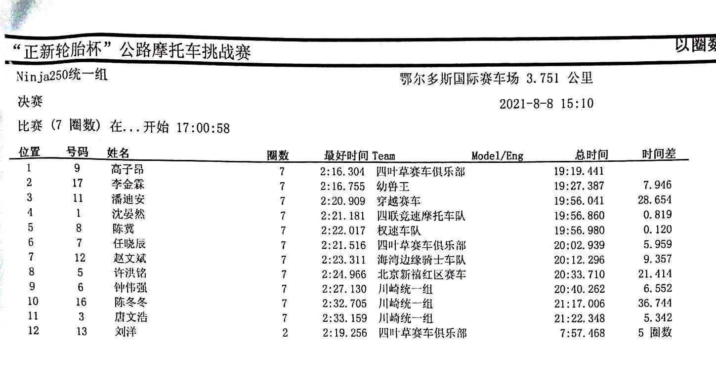Ninja 250 統(tǒng)一組有 12 位參賽者報名,全部使用 Kawasaki Ninja 250 作為賽車。下面的圖片,是該級別的角逐現(xiàn)場和成績。